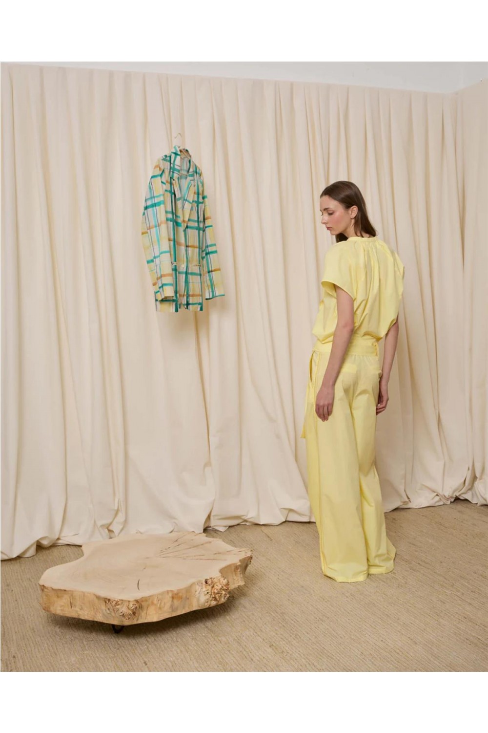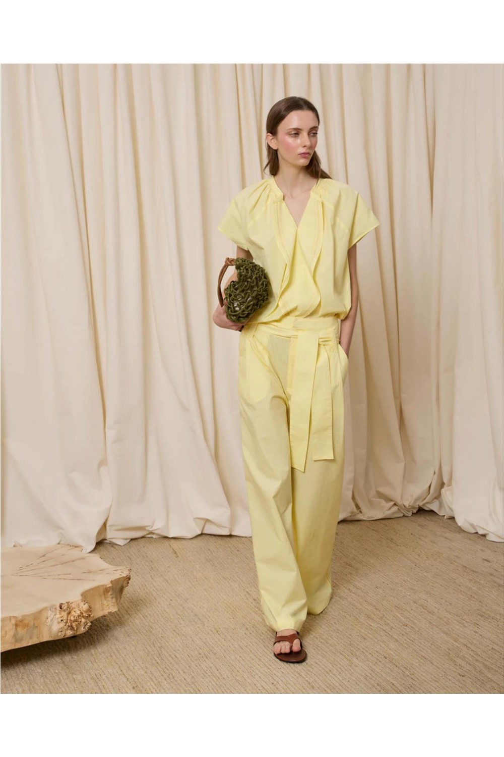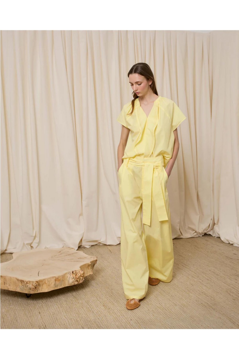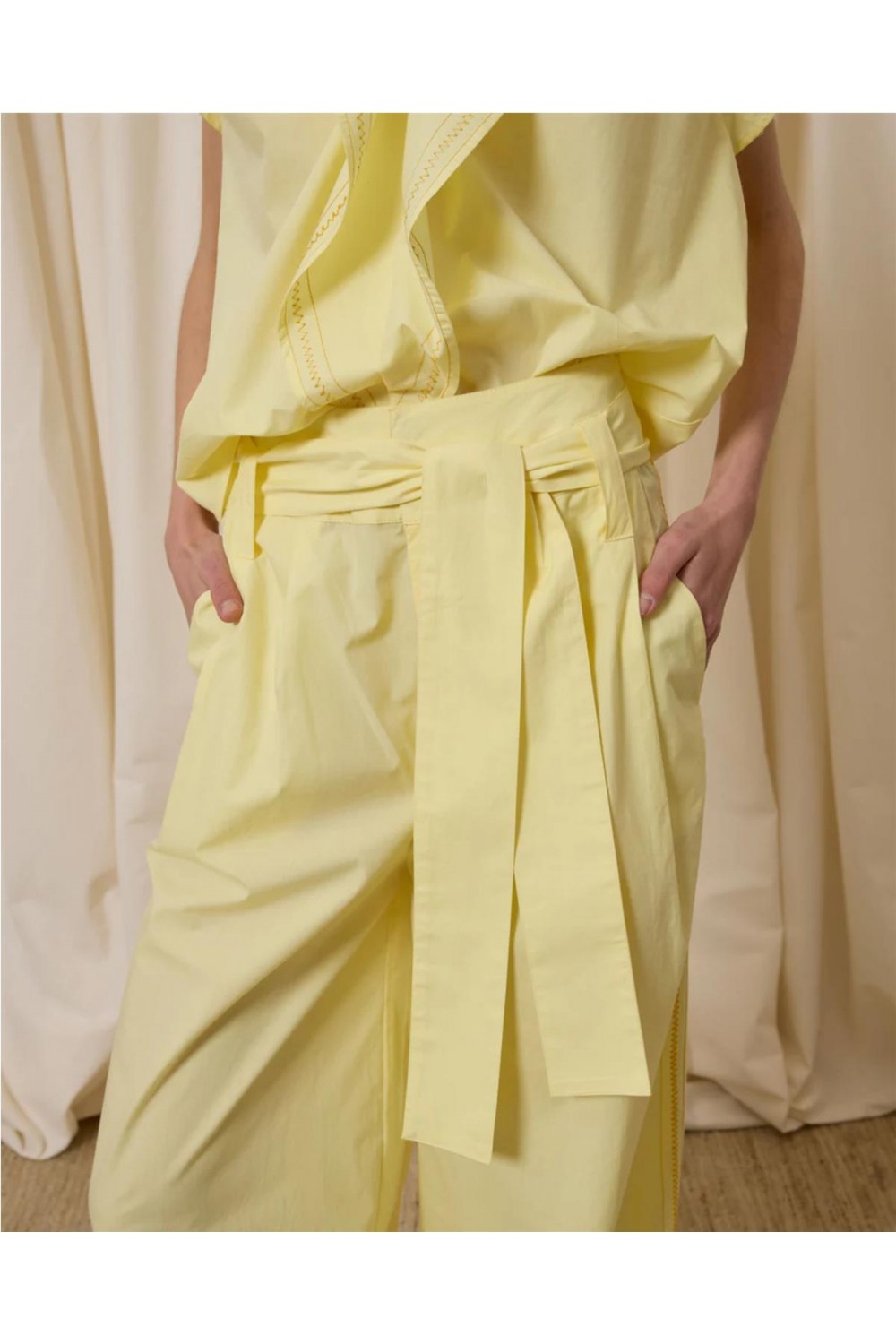 Pantalón de vestir de mujer pinzas Is coming amplio popelín algodón amarillo blanco 621.PAN.6211