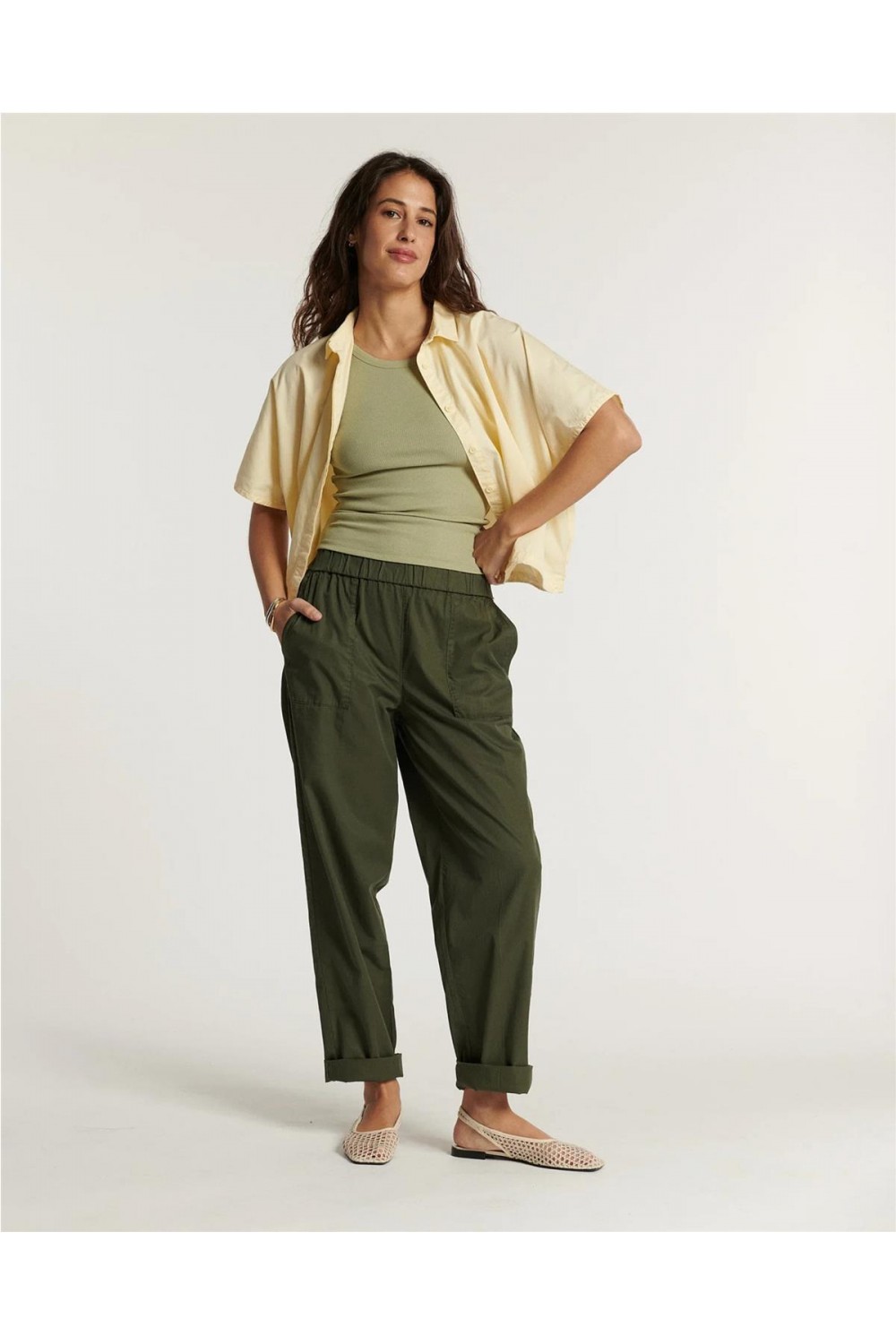 Pantalón de vestir de mujer Milpa Labdip corte carotte ecoresponsable kaki almendra garrapiñada MILPA-1652