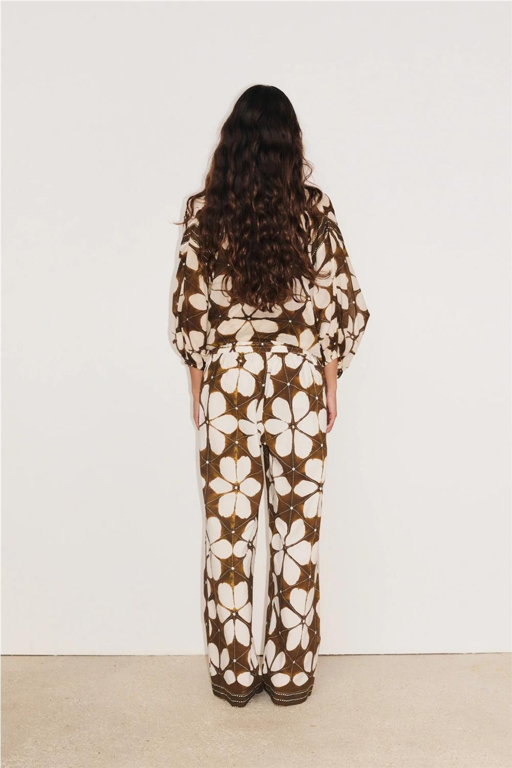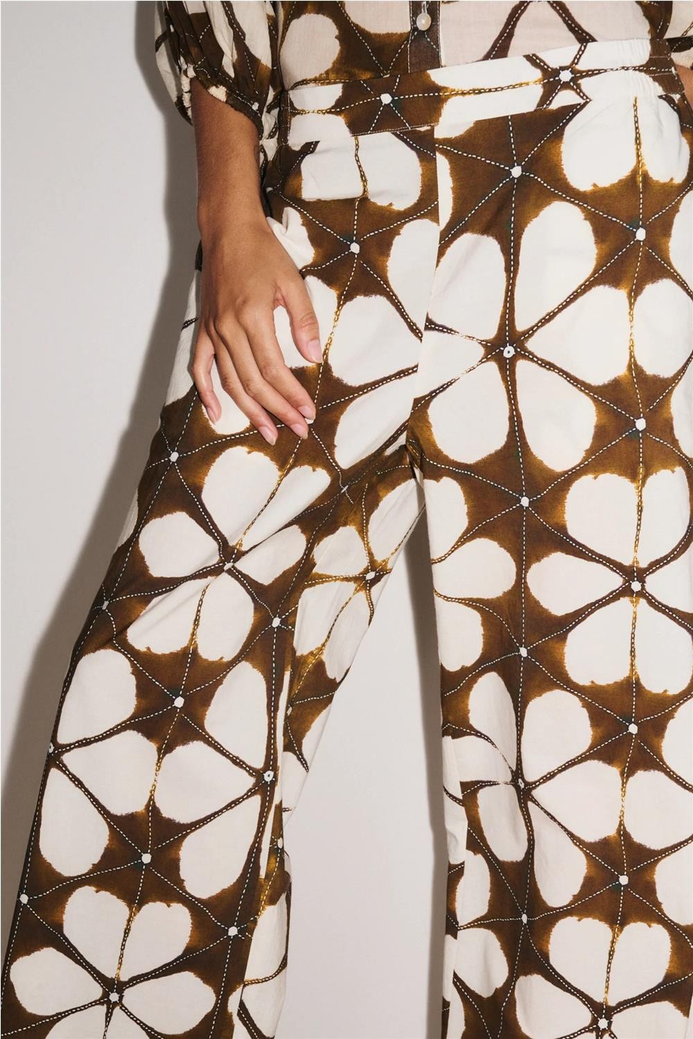 Pantalón de vestir Lotus con corte fluido y diseño atemporal en tejido ligero y suave al tacto. Cintura con elástico para comodidad y silueta relajada, bolsillos laterales y detalle de rayas que aportan un aire gráfico y contemporáneo, ideal para combinar con otras piezas versátiles del armario. Composición: 100 % algodón.
