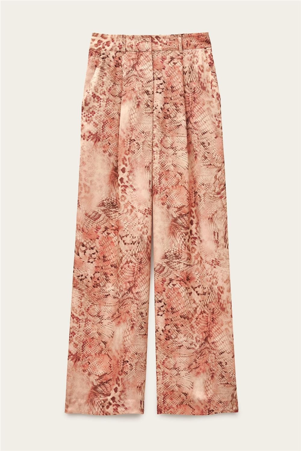 Este pantalón de vestir, confeccionado en un tejido fluido con caída impecable, destaca por su llamativo estampado de inspiración animal y su sofisticado talle alto. Presenta un diseño de pernera ancha con pinzas delanteras que aportan estructura y volumen, complementado con una cintura con trabillas. Gracias a su estética moderna y silueta elegante, esta pieza se convierte en una opción ideal para crear conjuntos llenos de personalidad y distinción. Composición: 100% Poliéster.