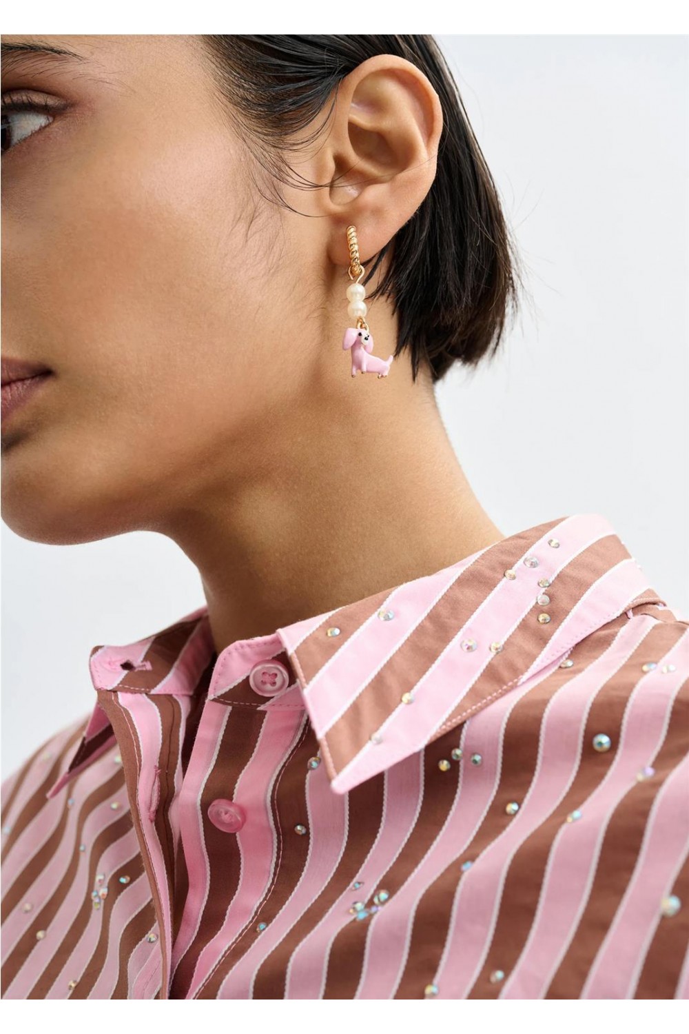Estos pendientes destacan por su divertido diseño de aro con acabado dorado, donde cada pieza presenta detalles únicos. Uno de los aros cuenta con una perla brillante y un original colgante en forma de perro salchicha, mientras que el otro está adornado con un cristal facetado y un orbe engastado en pavé. Confeccionados con strass de cristal y esmalte, son el accesorio perfecto para añadir un toque creativo y sofisticado. Composición: 40% Aleación de zinc, 20% Latón, 20% Esmalte, 20% Vidrio.