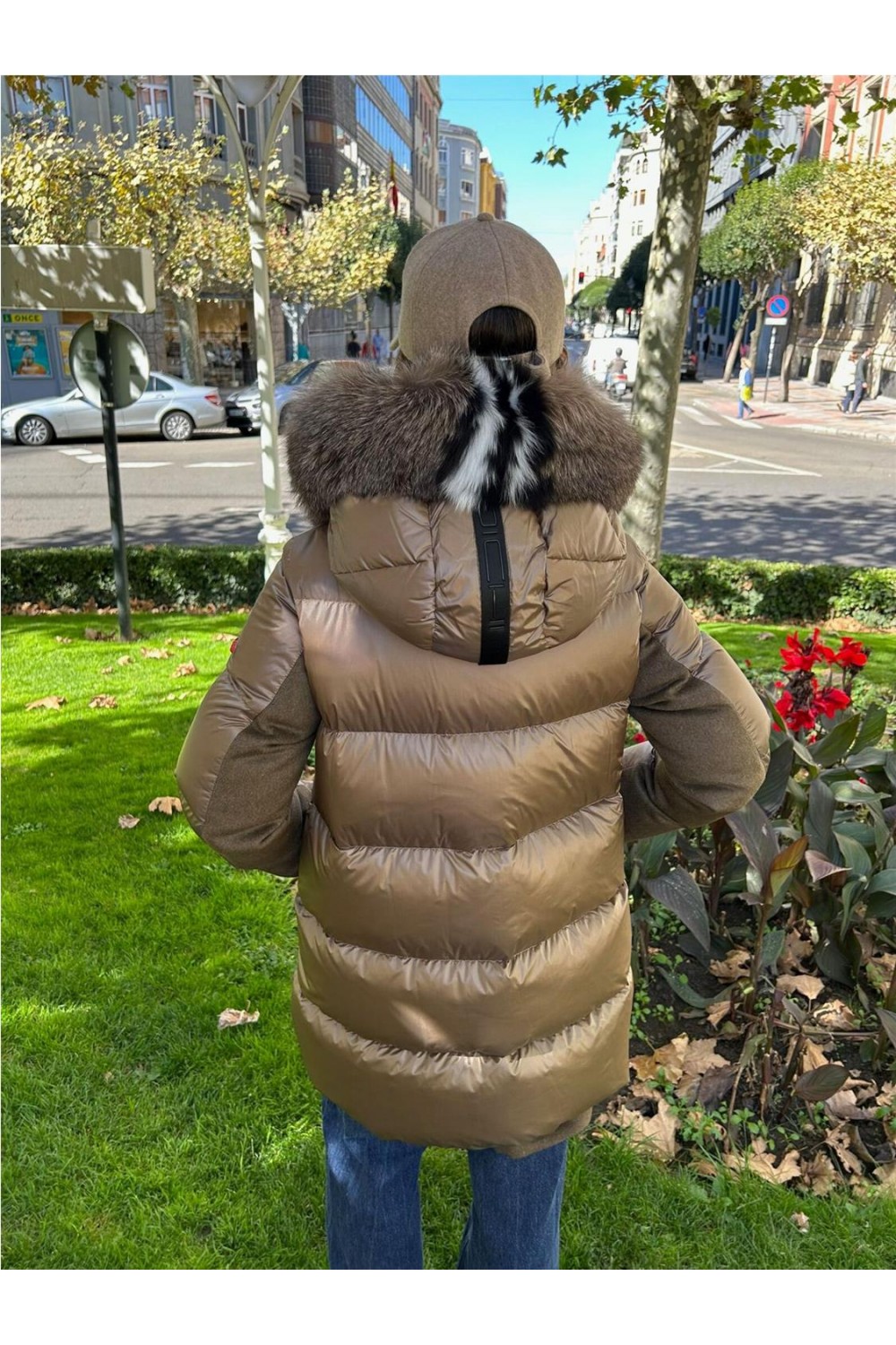 Plumas de largo medio de manga pegada y logo lateral. Puños elásticos. Corte ligeramente acampanado. Cierre con cremallera, tapeta en paño de lana y botones. Bolsos frontales con detalle en paño de lana. Incorpora capucha fija con pelo natural fox desmontable. Tejido en nylon acabado en mate y detalles en paño de lana. Repelente al agua, transpirable y gran capacidad térmica . COMPOSICION.- Tejido exterior: 50% poliester, 50% lana; Relleno: 90% plumón de pato, 10% plumino.