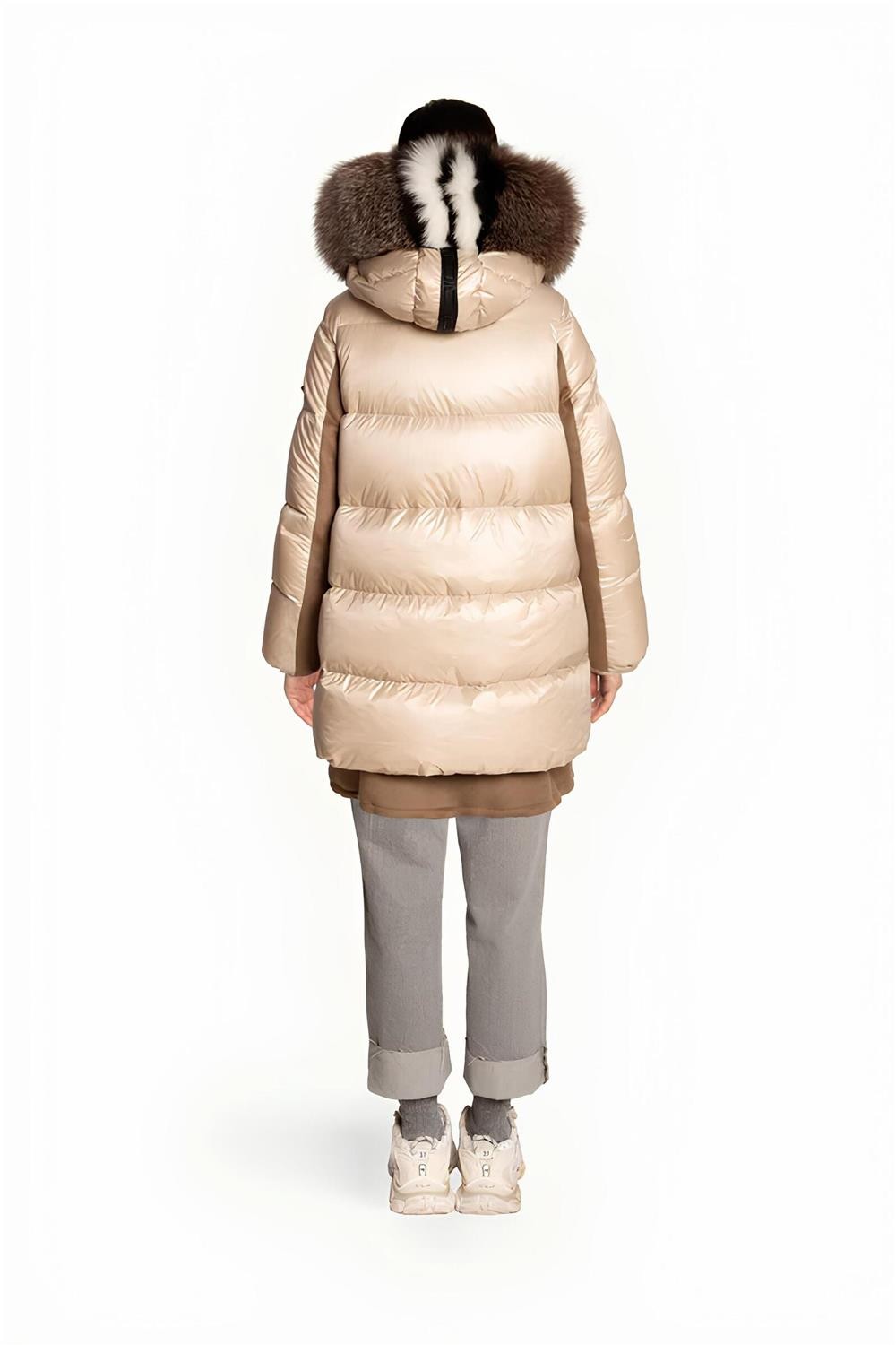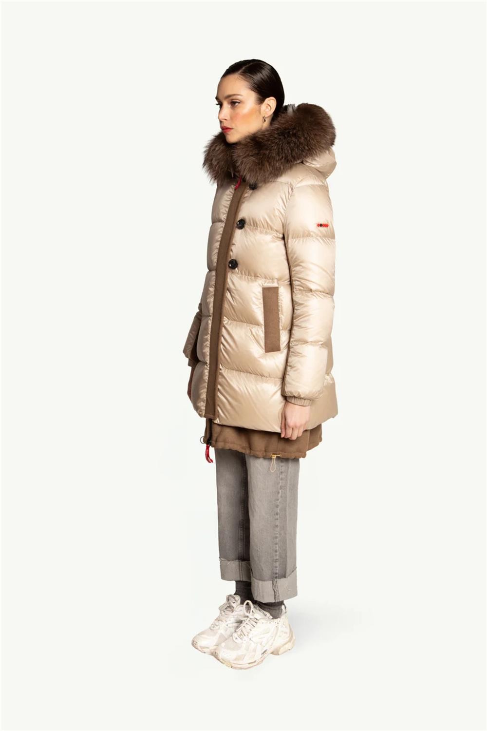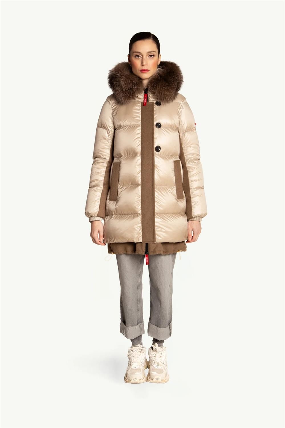 Plumas de largo medio de manga pegada y logo lateral. Puños elásticos. Corte ligeramente acampanado. Cierre con cremallera, tapeta en paño de lana y botones. Bolsos frontales con detalle en paño de lana. Incorpora capucha fija con pelo natural fox desmontable. Tejido en nylon acabado en mate y detalles en paño de lana. Repelente al agua, transpirable y gran capacidad térmica . COMPOSICION.- Tejido exterior: 50% poliester, 50% lana; Relleno: 90% plumón de pato, 10% pluma..