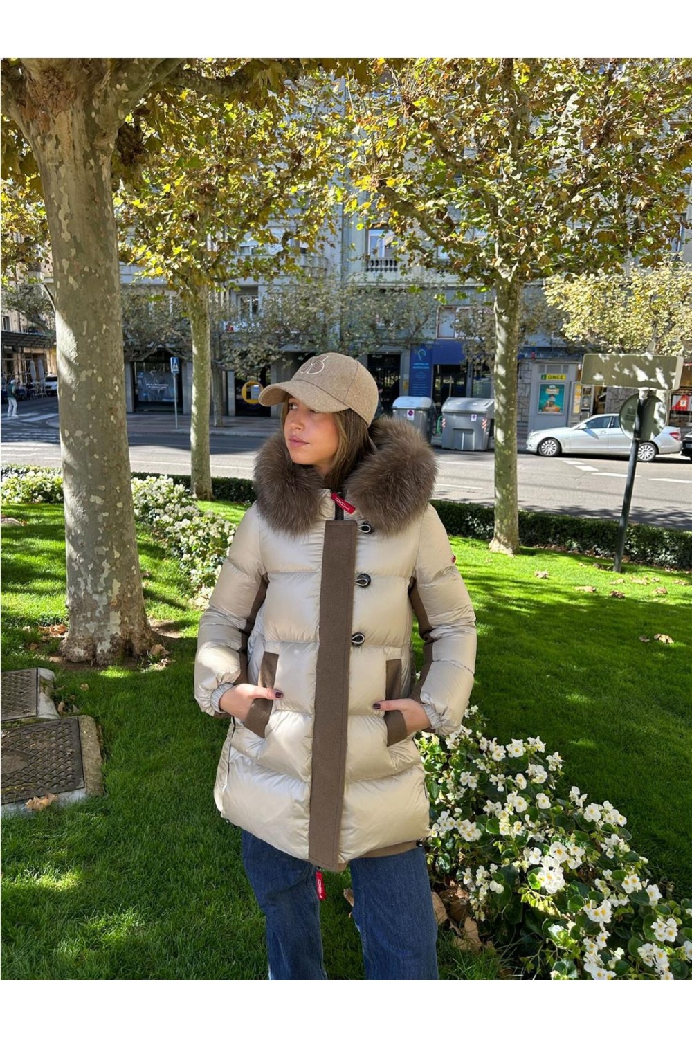 Plumas de largo medio de manga pegada y logo lateral. Puños elásticos. Corte ligeramente acampanado. Cierre con cremallera, tapeta en paño de lana y botones. Bolsos frontales con detalle en paño de lana. Incorpora capucha fija con pelo natural fox desmontable. Tejido en nylon acabado en mate y detalles en paño de lana. Repelente al agua, transpirable y gran capacidad térmica . COMPOSICION.- Tejido exterior: 50% poliester, 50% lana; Relleno: 90% plumón de pato, 10% plumino.