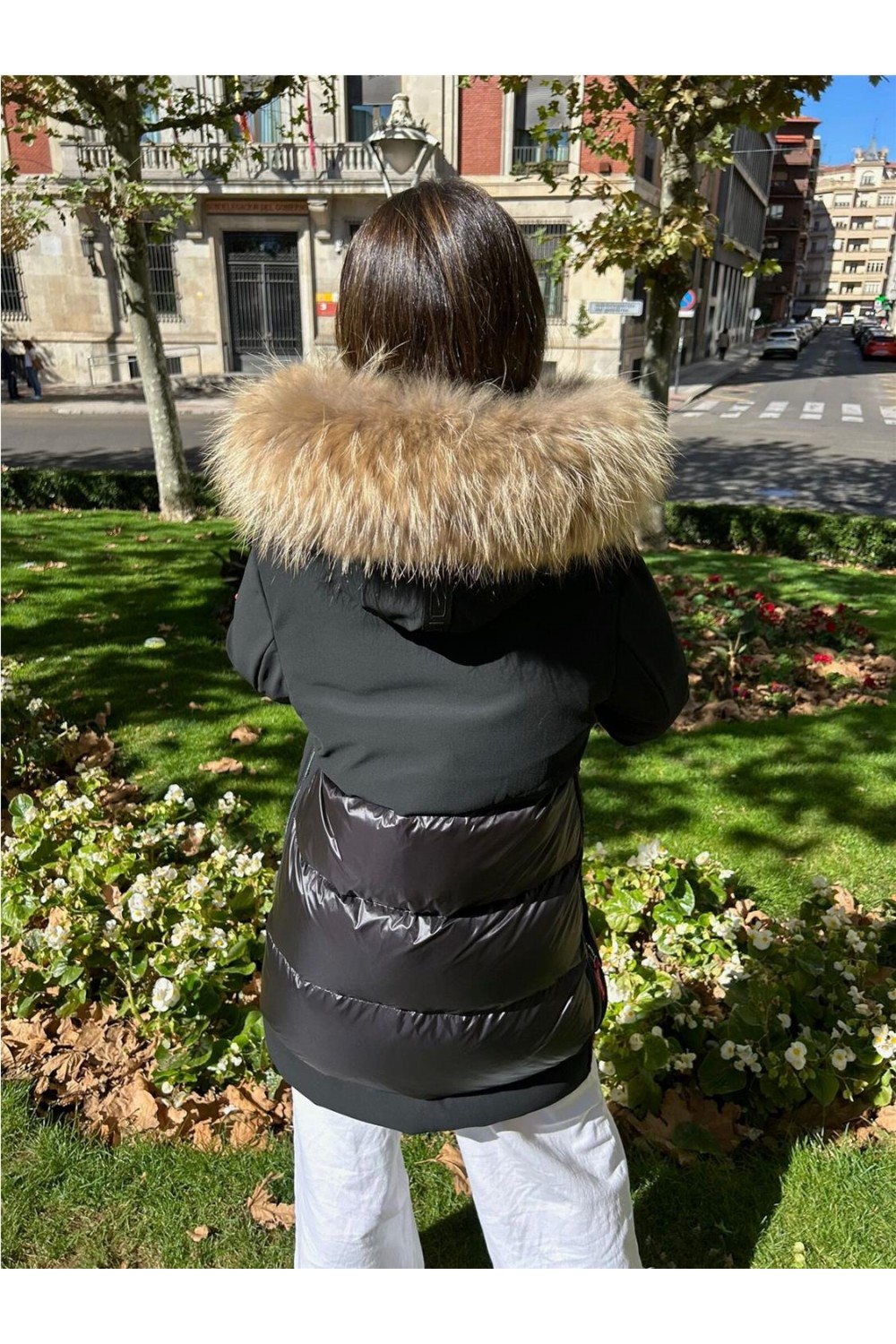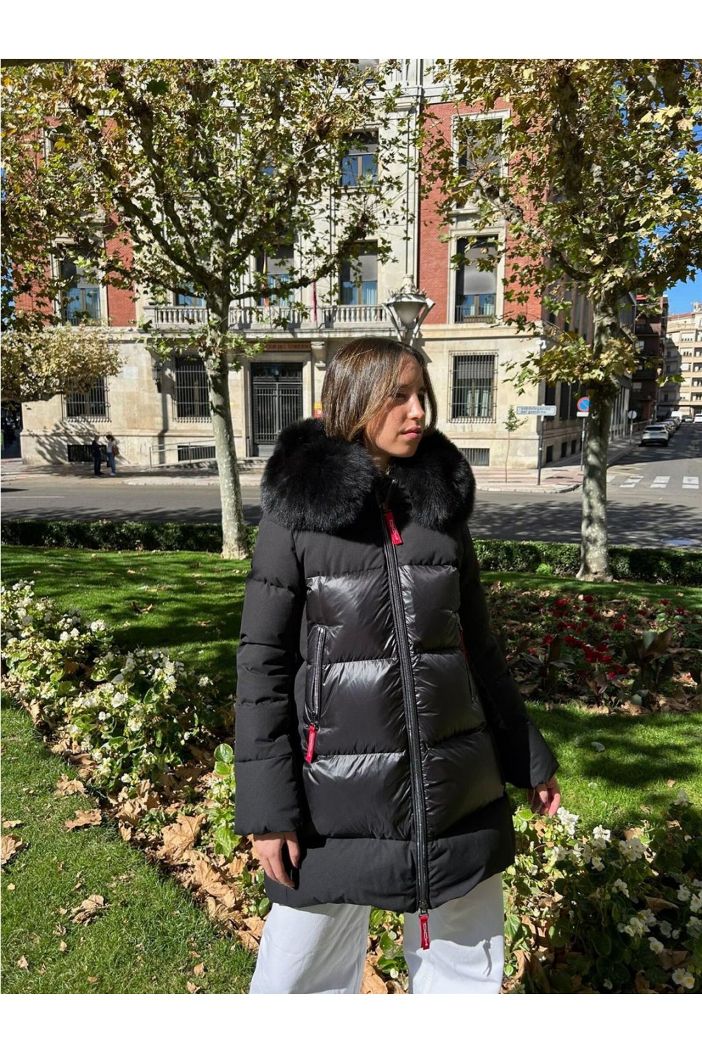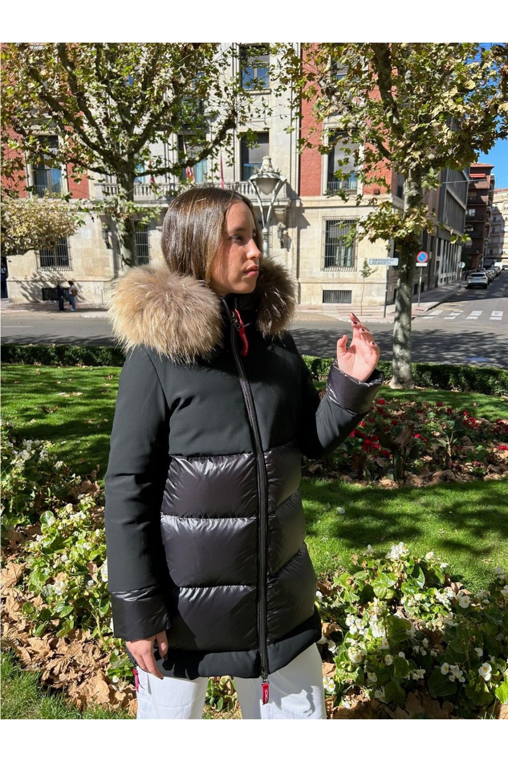 Plumas de largo medio con logo en manga. Corte recto. Cierre con cremallera de doble cursor. Bolsos laterales ocultos. Amplias aberturas laterales con cremallera. Capucha fija con pelo natural racoon desmontable. Tejido en nylon acabado en brillo y mate. Repelente al agua, transpirable y gran capacidad térmica. COMPOSICION.- Tejido exterior: 80% poliamida, 20% elastano; Relleno: 90% plumón de pato, 10% plumino.