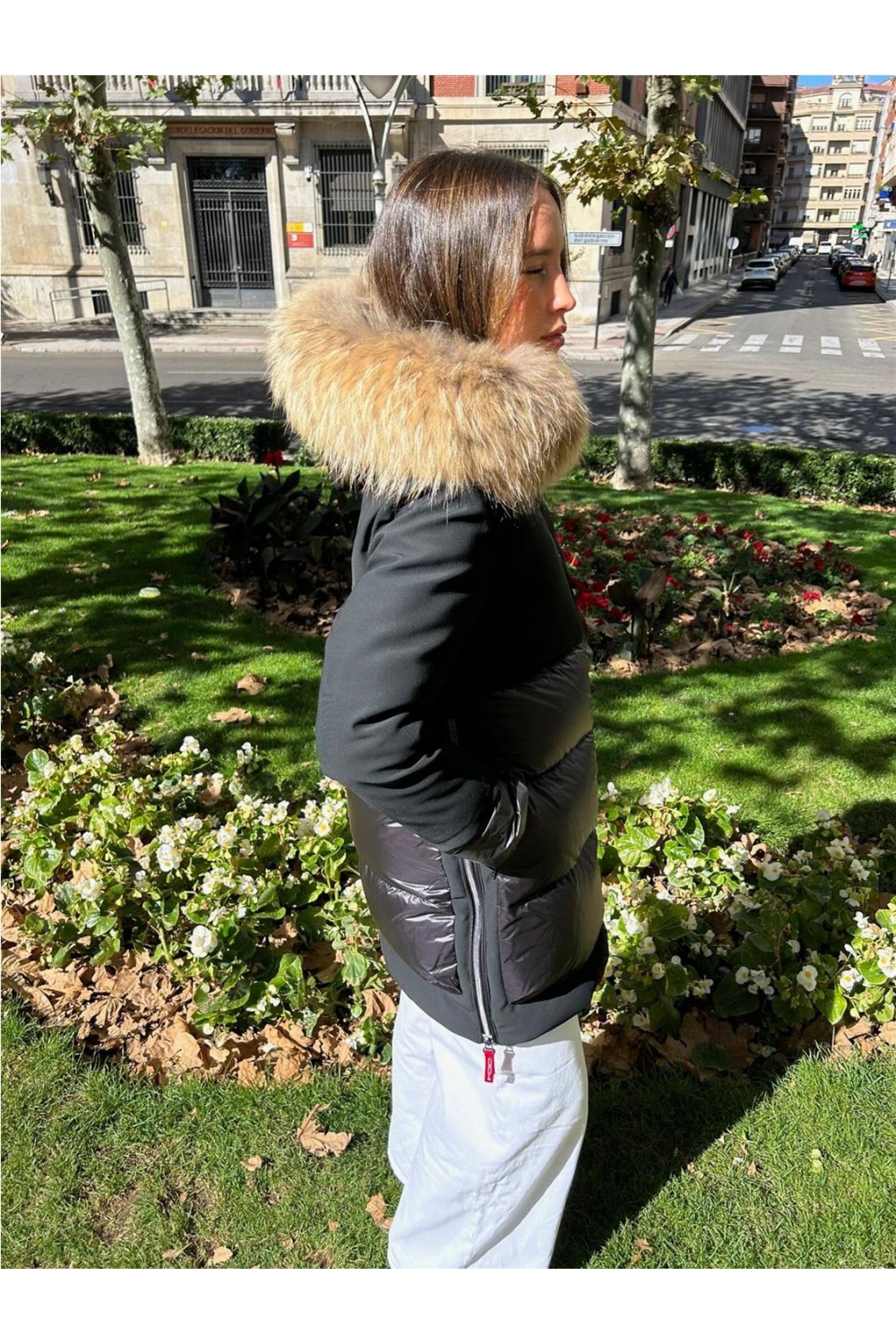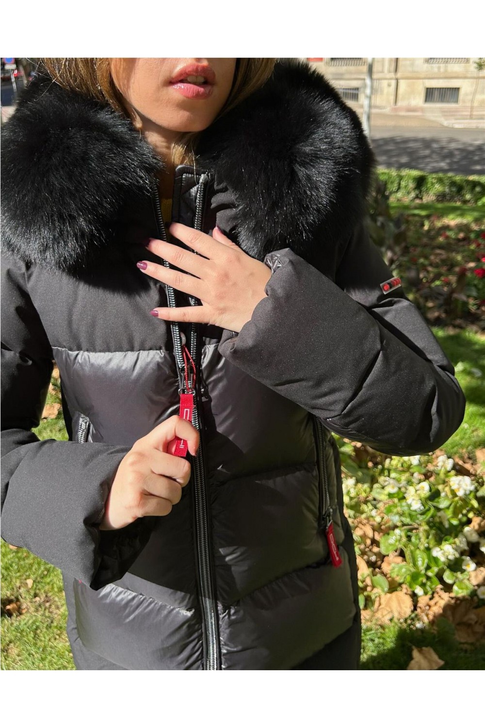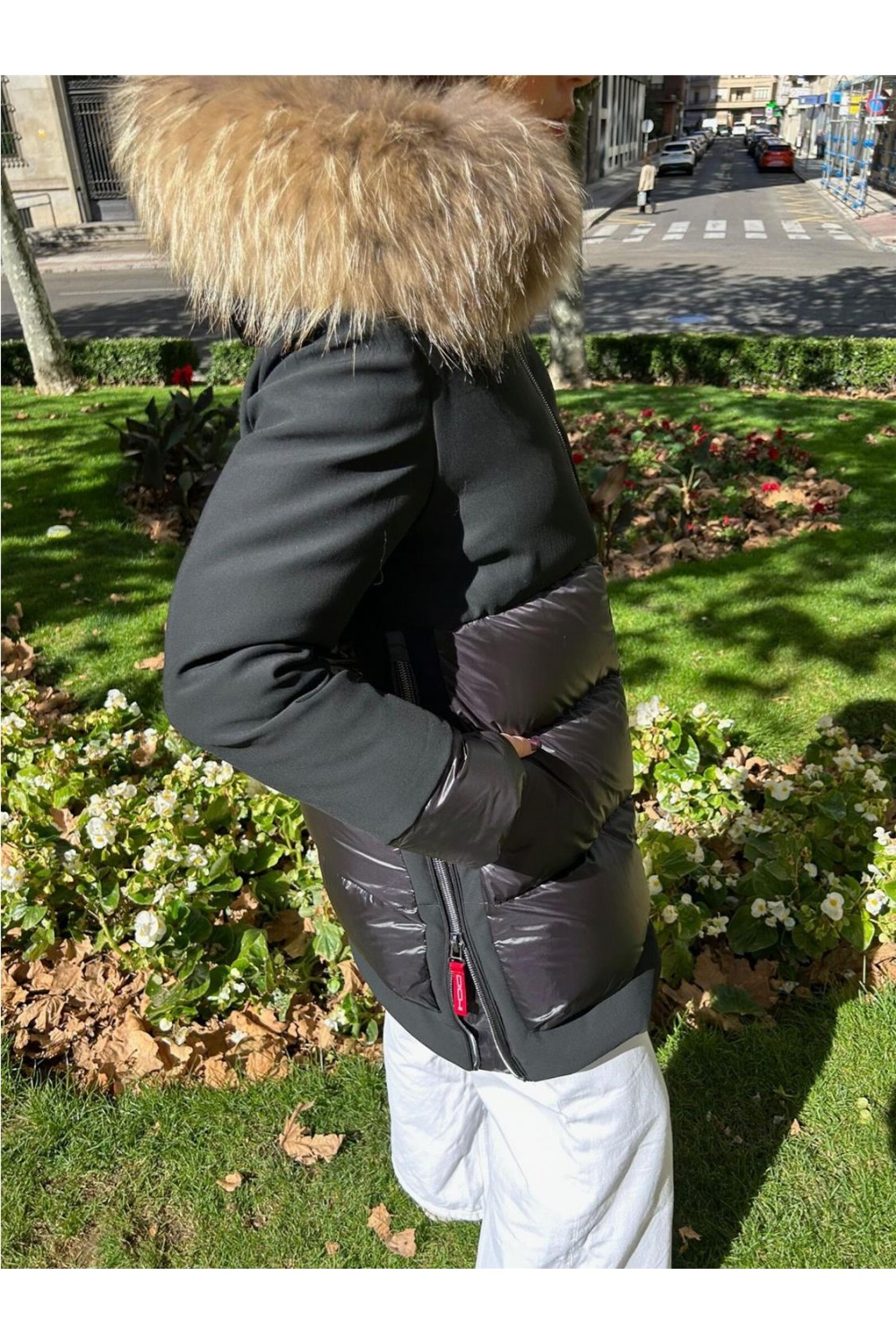 Plumas de largo medio con logo en manga. Corte recto. Cierre con cremallera de doble cursor. Bolsos laterales ocultos. Amplias aberturas laterales con cremallera. Capucha fija con pelo natural racoon desmontable. Tejido en nylon acabado en brillo y mate. Repelente al agua, transpirable y gran capacidad térmica. COMPOSICION.- Tejido exterior: 80% poliamida, 20% elastano; Relleno: 90% plumón de pato, 10% plumino.