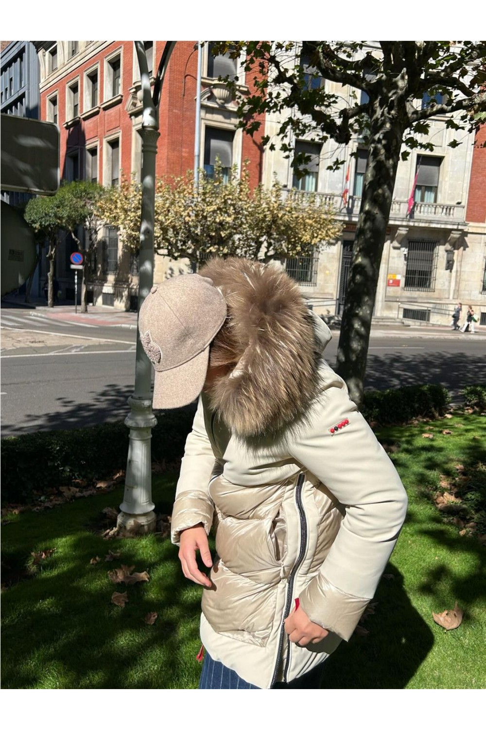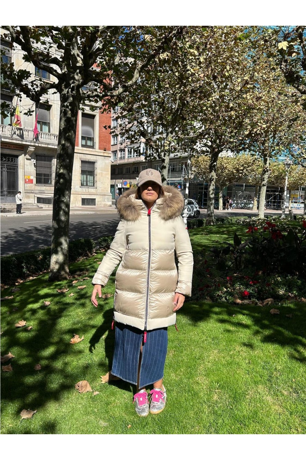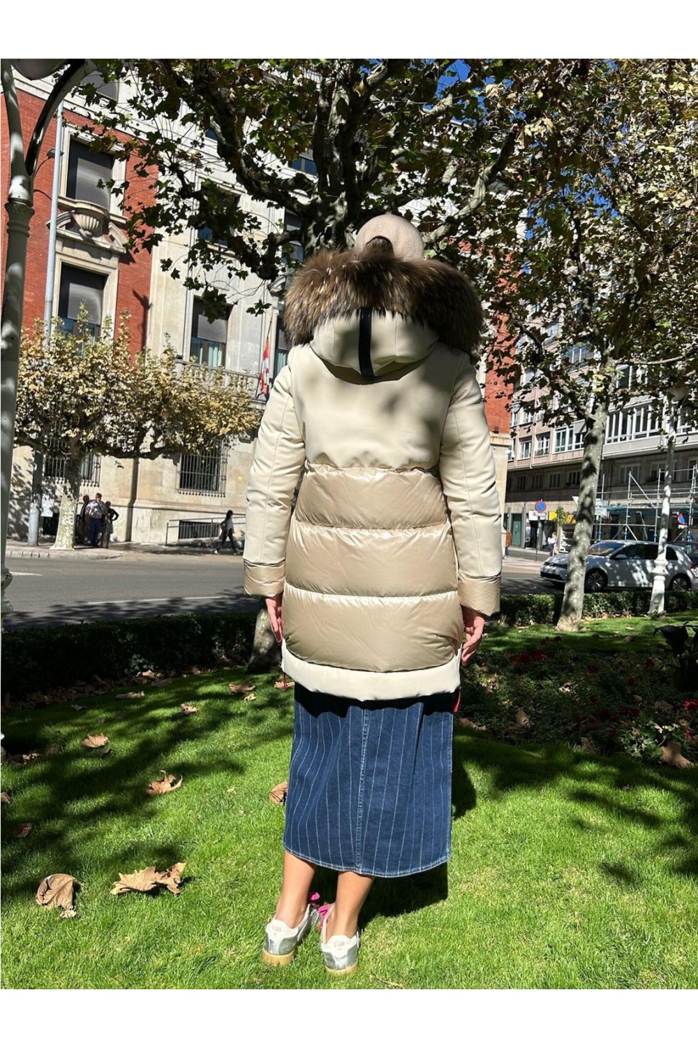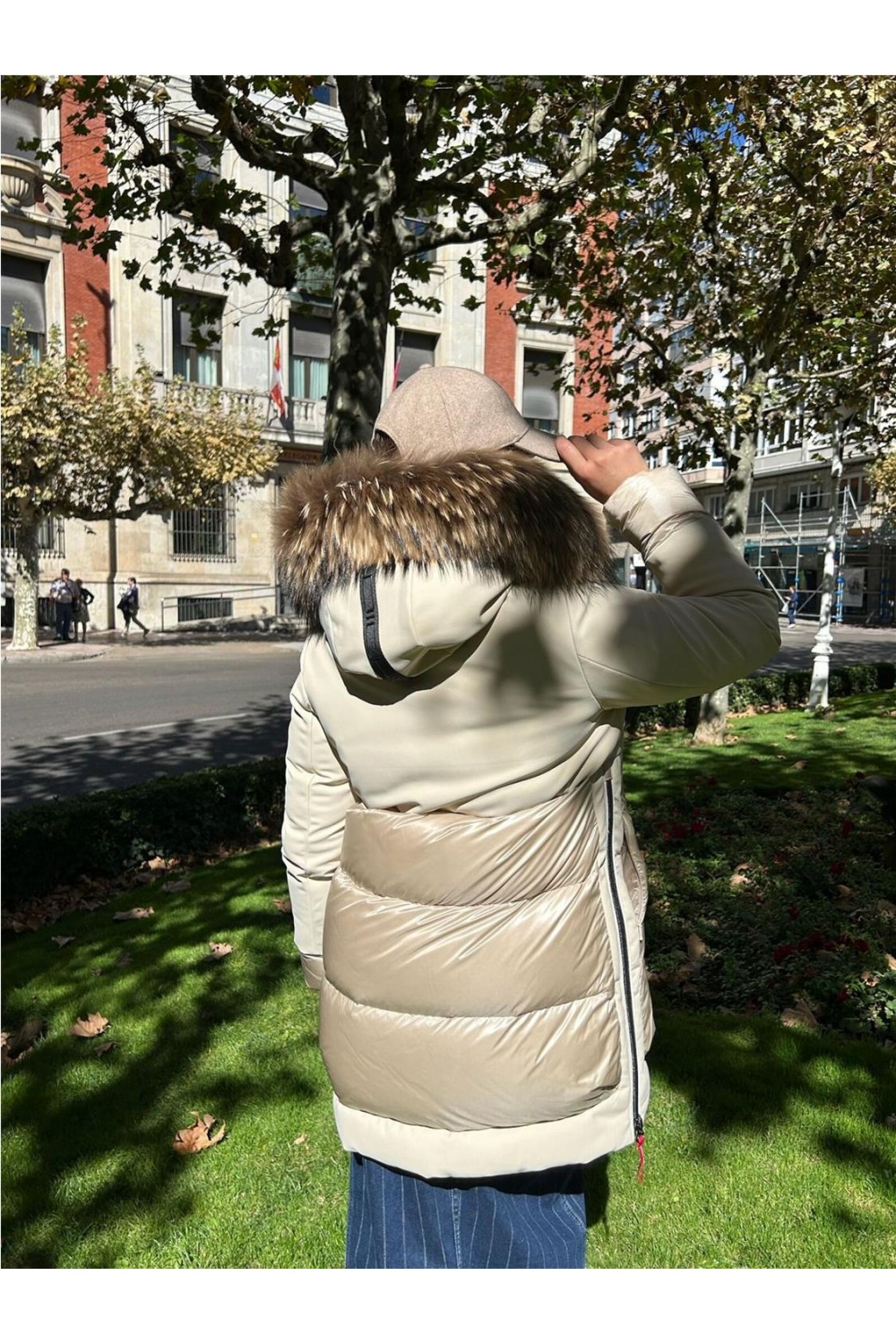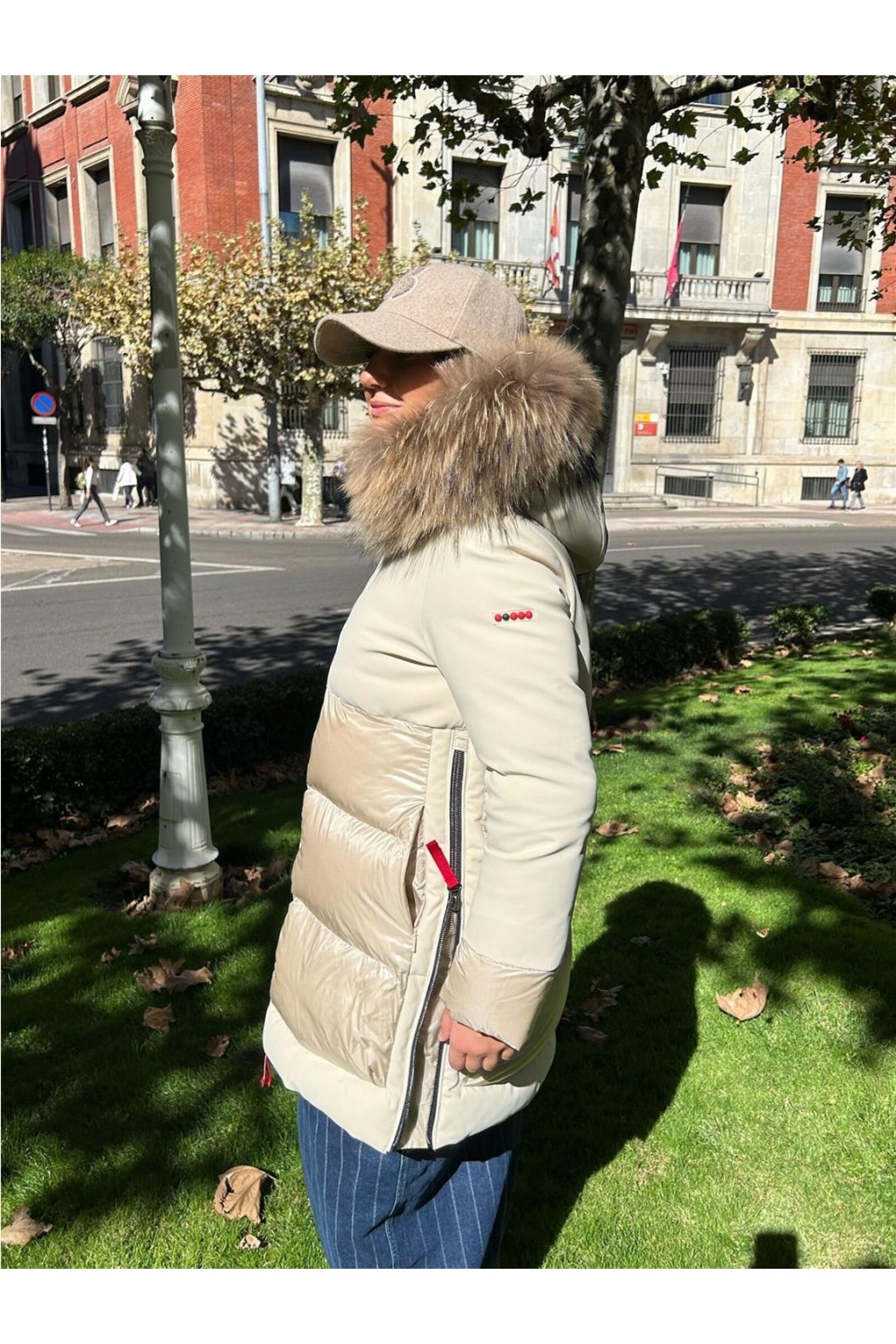 Plumas de largo medio con logo en manga. Corte recto. Cierre con cremallera de doble cursor. Bolsos laterales ocultos. Amplias aberturas laterales con cremallera. Capucha fija con pelo natural racoon desmontable. Tejido en nylon acabado en brillo y mate. Repelente al agua, transpirable y gran capacidad térmica. COMPOSICION.- Tejido exterior: 80% poliamida, 20% elastano; Relleno: 90% plumón de pato, 10% plumino.