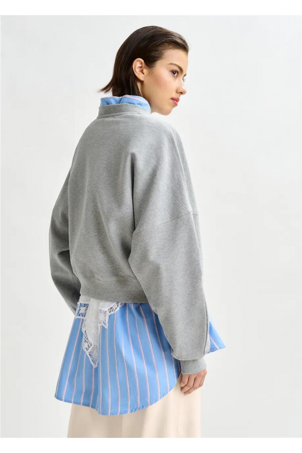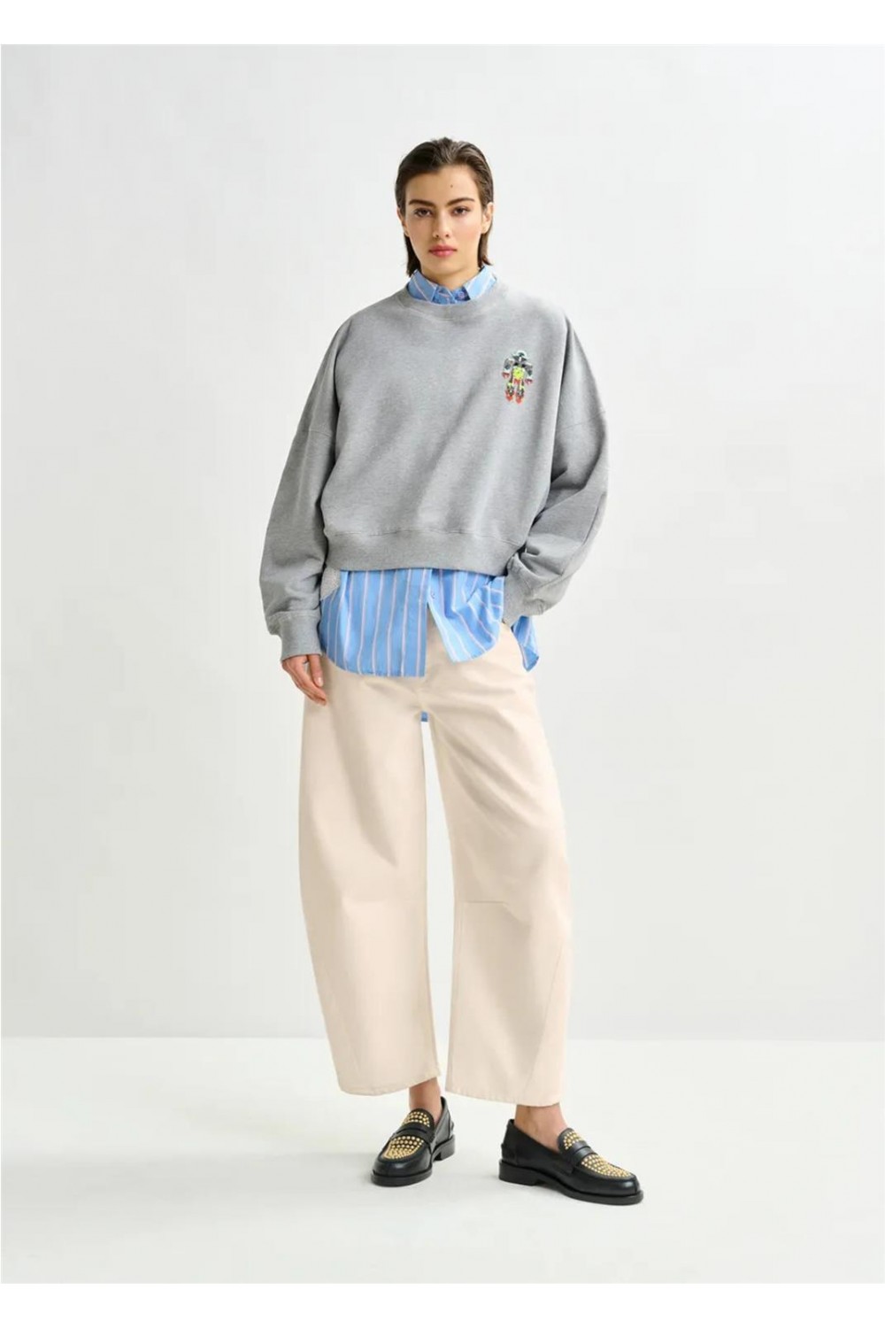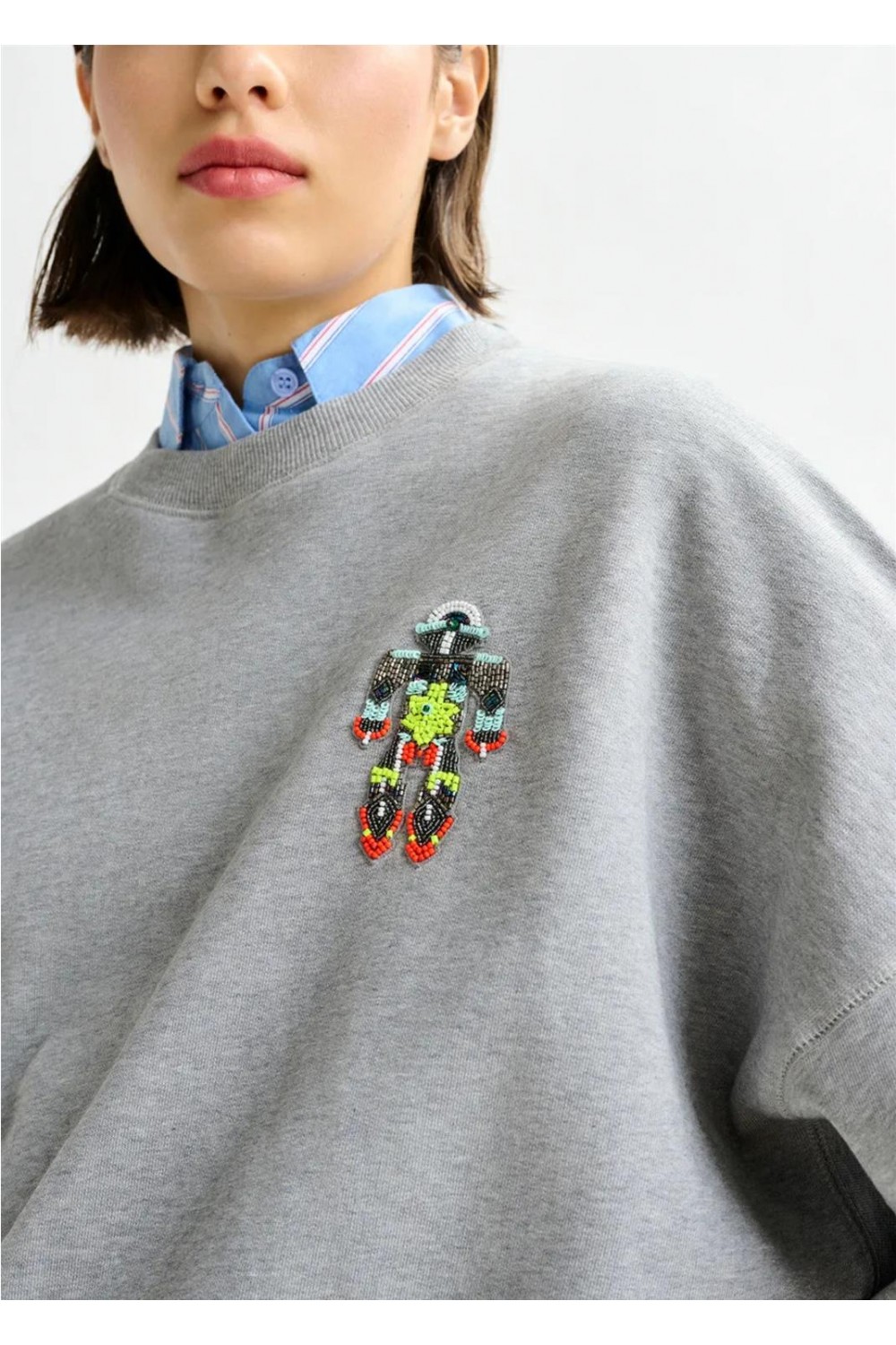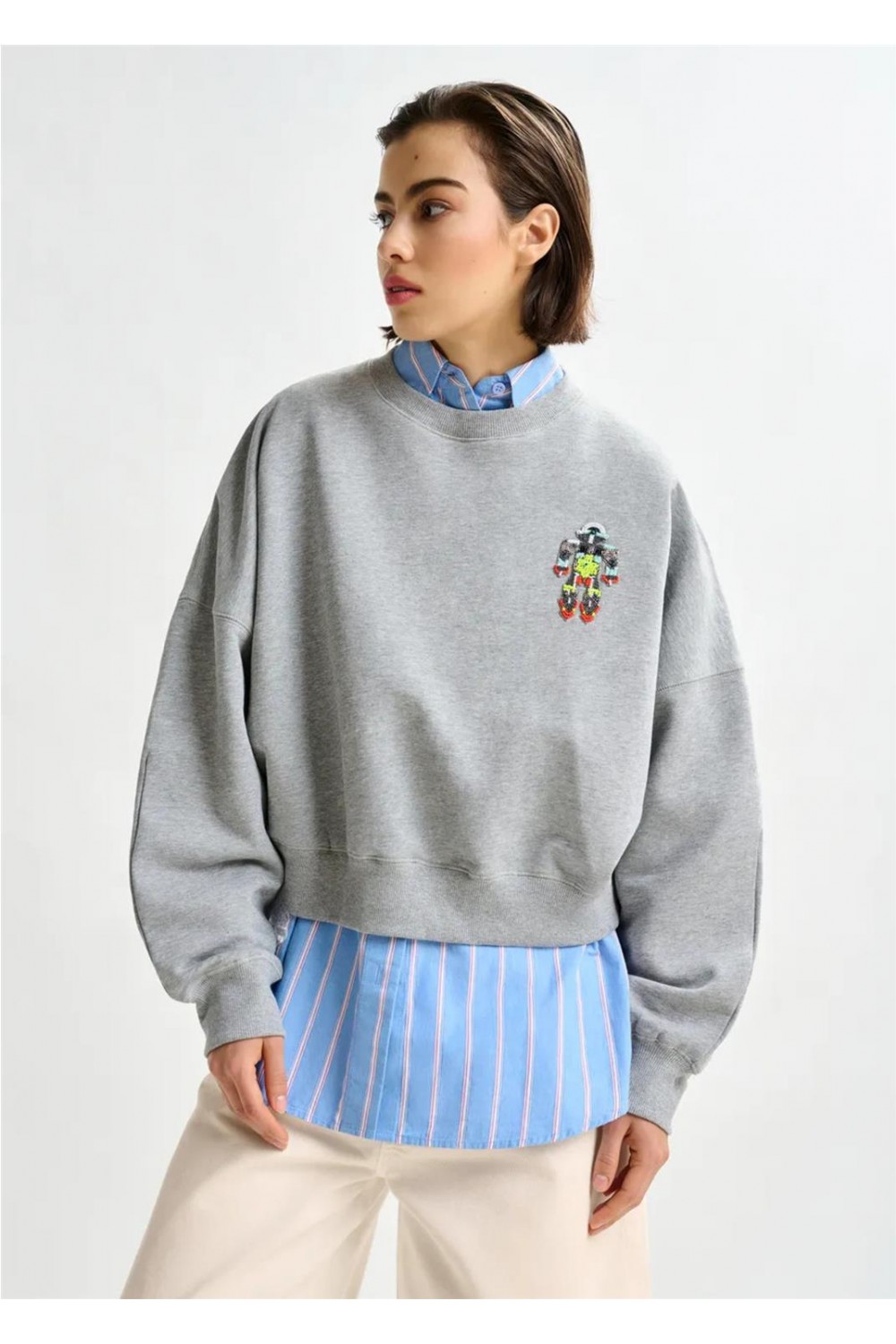 Sudadera de suave punto de algodón, con un corte relajado y detalles de doble costura para un estilo casual y moderno. La prenda está adornada con un vibrante bordado que combina lentejuelas y abalorios, aportando un toque brillante y electrizante a un básico de armario. Presenta hombros caídos (dropped shoulders) que acentúan su silueta cómoda. Composición: 100% algodón. Lentejuelas: 100% cloruro de polivinilo. Abalorios: 100% fibra de vidrio; 100% cristal.