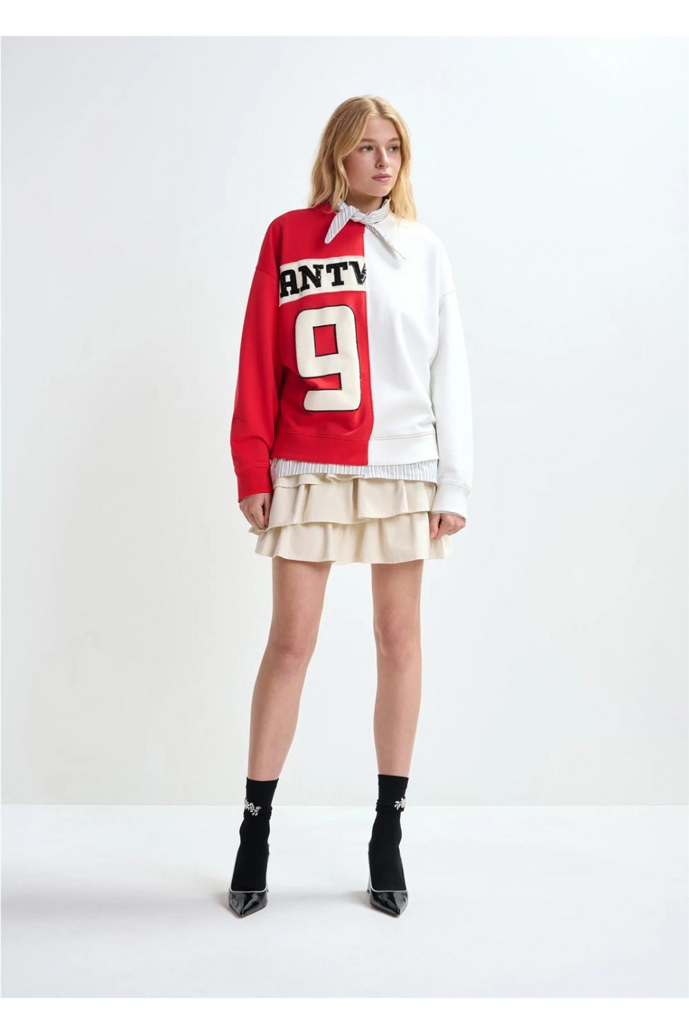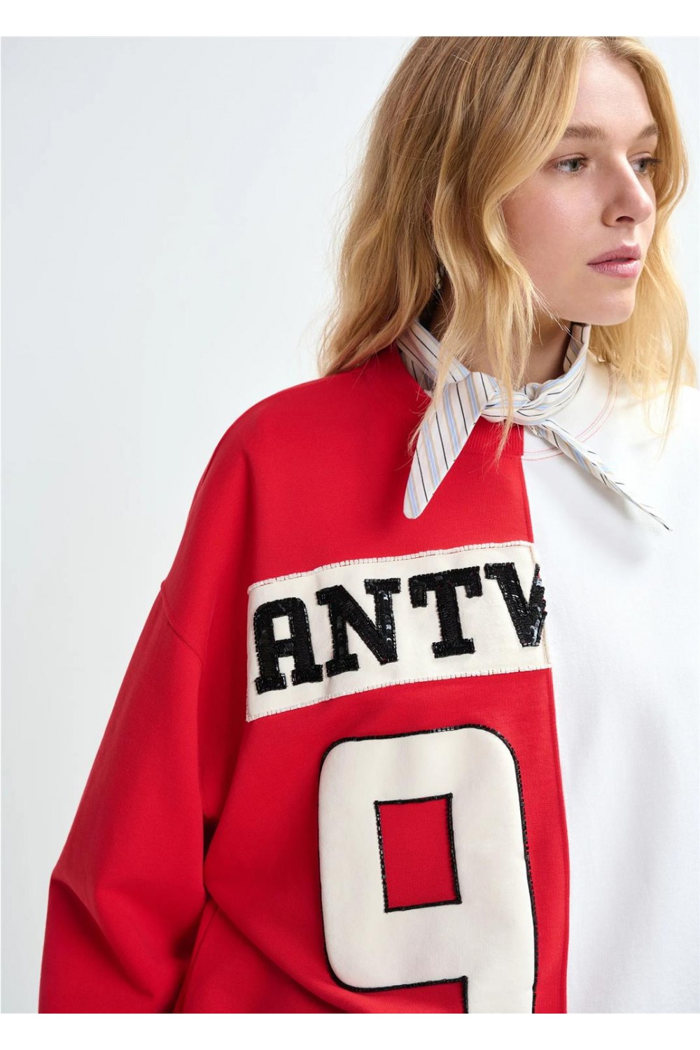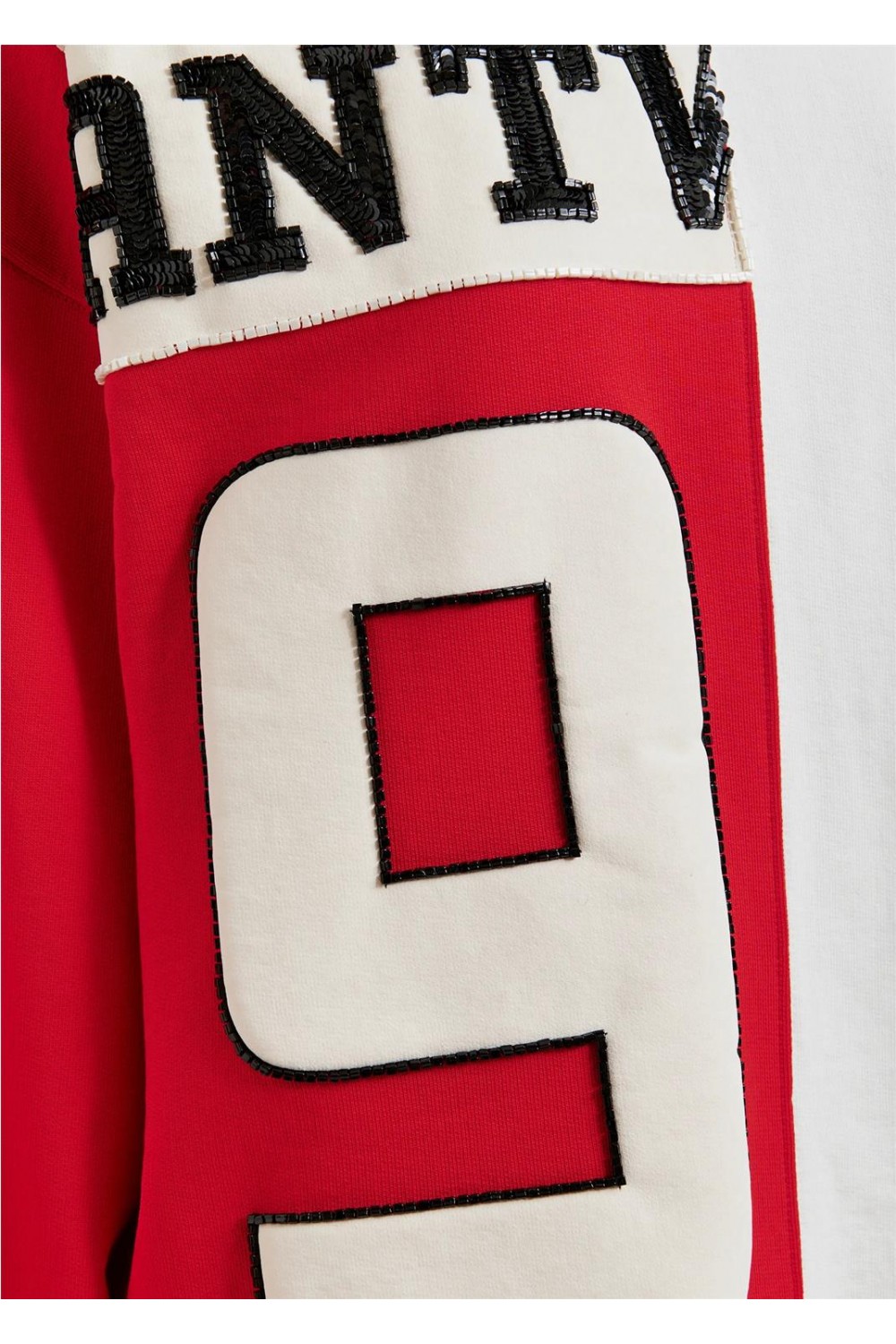 Esta sudadera destaca por su confección en jersey de algodón con un diseño de paneles partidos que crea un contraste gráfico. Presenta un corte holgado, hombros caídos y doble costura en contraste. La parte delantera incluye un gran aplique decorativo con lentejuelas y cuentas, aportando un acabado refinado y sensorial que eleva esta pieza casual. Composición: 100% Algodón. Lentejuelas: 100% Cloruro de polivinilo. Cuentas: 100% Fibra de vidrio.