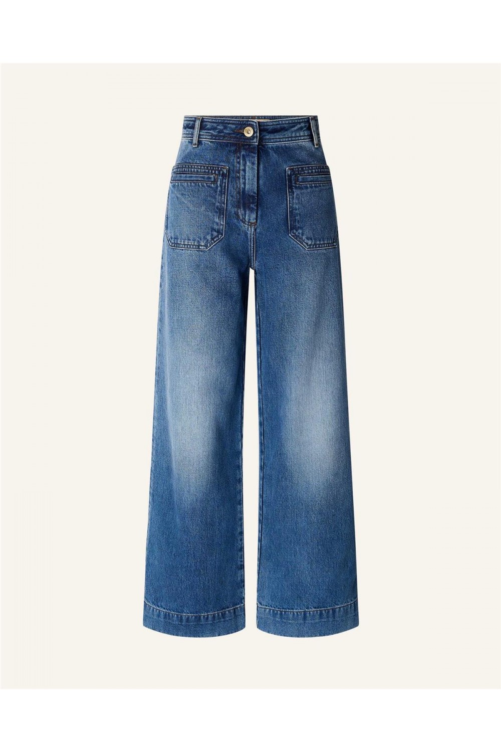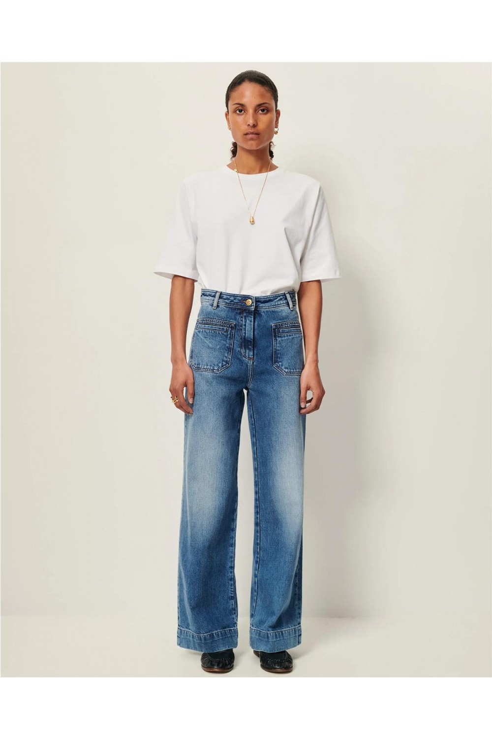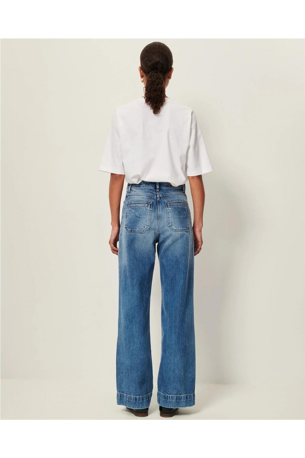 Pantalón vaquero de talle alto y corte acampanado está confeccionado en denim lavado a la piedra de algodón orgánico con certificado GOTS. Presenta un diseño de pernera larga con una vuelta amplia en el bajo, cierre de botón y cremallera oculta. Incluye prácticos bolsillos de parche ribeteados tanto delante como detrás, y una etiqueta de piel con el grabado de la marca. Es una prenda con carácter retro que estiliza la figura gracias a su estructura y acabados cuidados. Composición: 100% Algodón
