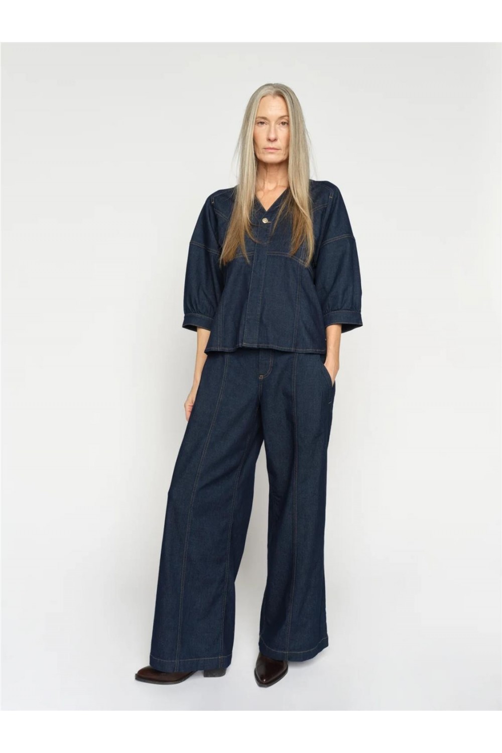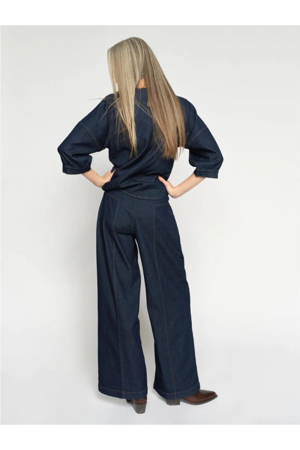 Pantalón vaquero de mujer de pierna ancha que evoca un estilo retro y refinado. Diseñados con tiro alto y un frontal de acabado limpio, ofrecen una silueta favorecedora con una sensación estructurada pero cómoda. Su mezcla técnica de alta calidad asegura una excelente recuperación de la forma, siendo ideales para combinar con blazers o prendas de punto para un look impecable. Composición: 91% Cotton 7% Elastomultiester 2% Elastane.
