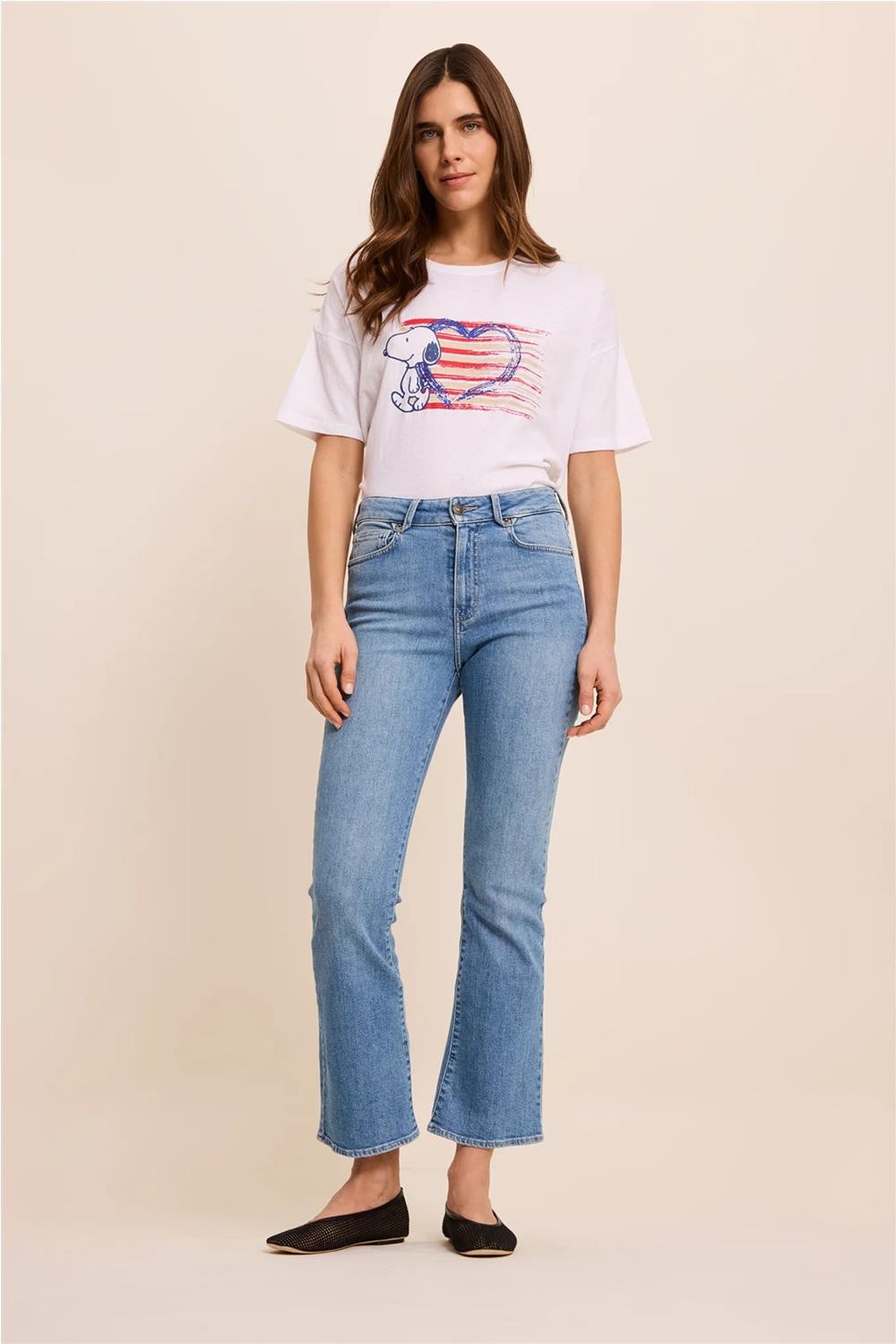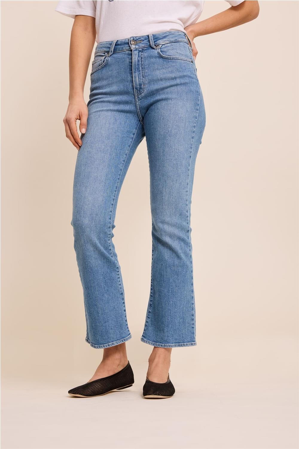 Este pantalón vaquero, de estilo flare cropped y talle estándar, destaca por su favorecedor corte acampanado y corto que estiliza la figura. Confeccionado en un cómodo denim de algodón con un toque de elastano para un ajuste óptimo, cuenta con el clásico diseño de cinco bolsillos y trabillas para el cinturón. Presenta un cierre de botón metálico y cremallera oculta, ofreciendo una silueta moderna y versátil ideal para combinar con cualquier tipo de calzado. Composición: 99% Algodón, 1% Elastano.