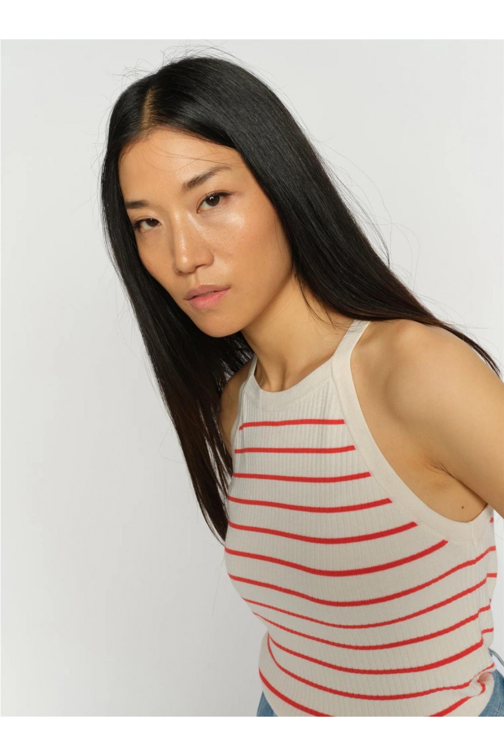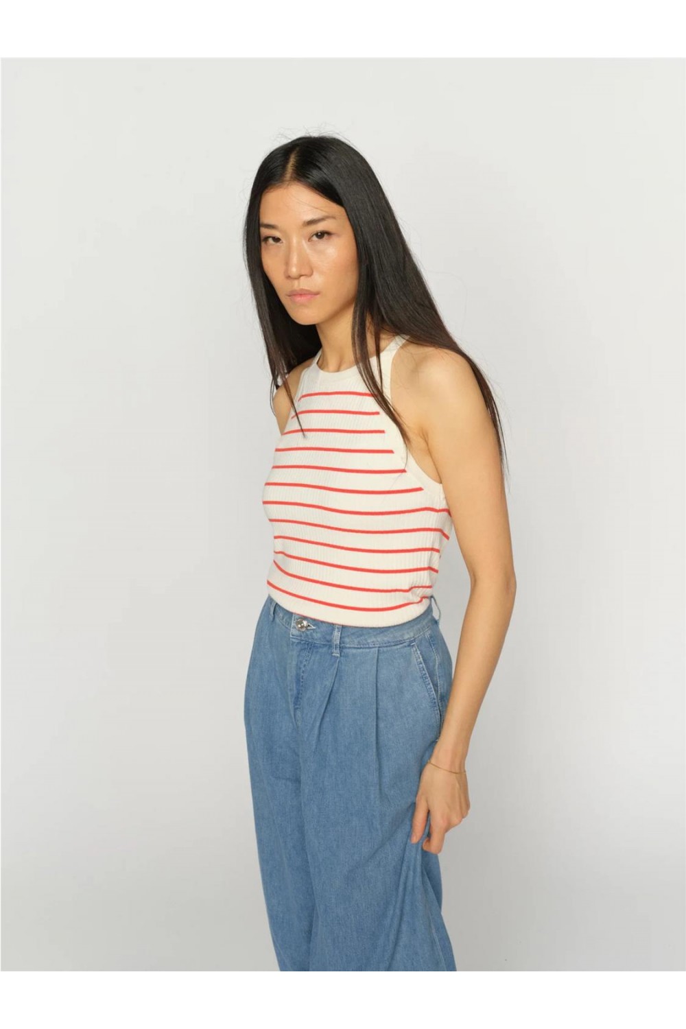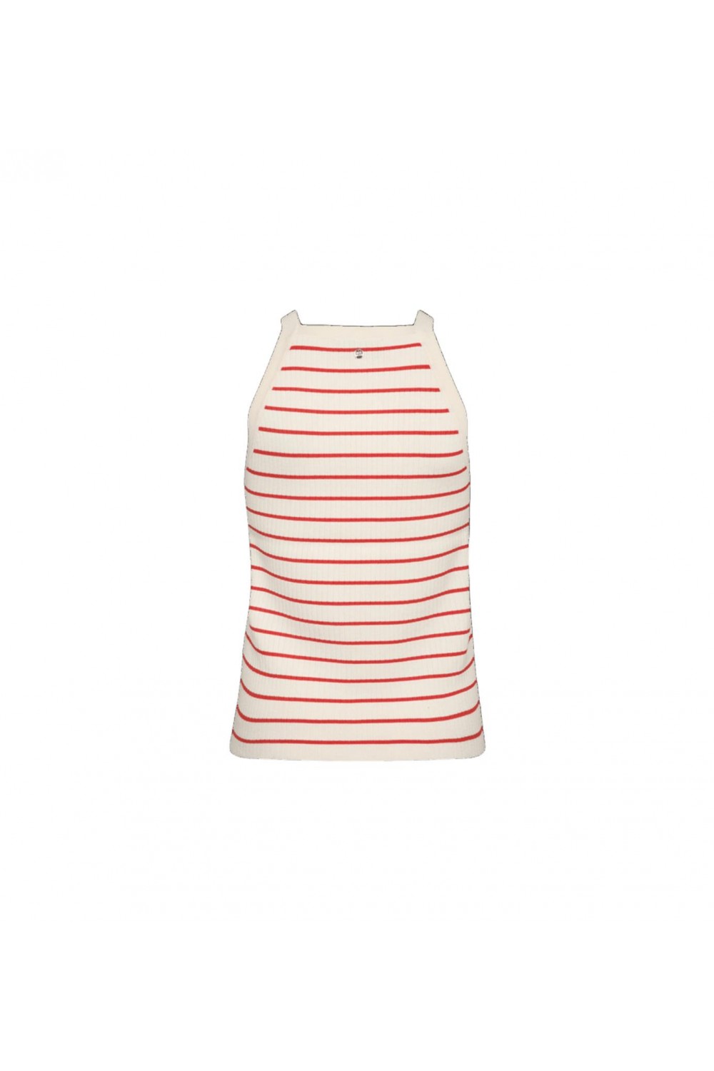 Top de punto sin mangas con un elegante diseño de rayas horizontales. Esta prenda destaca por su cuello redondo y un acabado de tejido fino que aporta un sutil brillo natural y una suavidad excepcional al contacto con la piel. Su silueta fluida y ligera lo convierte en una pieza clave para combinar con americanas o lucir de forma individual en los días más cálidos, aportando un aire chic y atemporal. Composición: 60% Viscosa LENZING™ ECOVERO™, 29% Poliéster, 11% Seda.