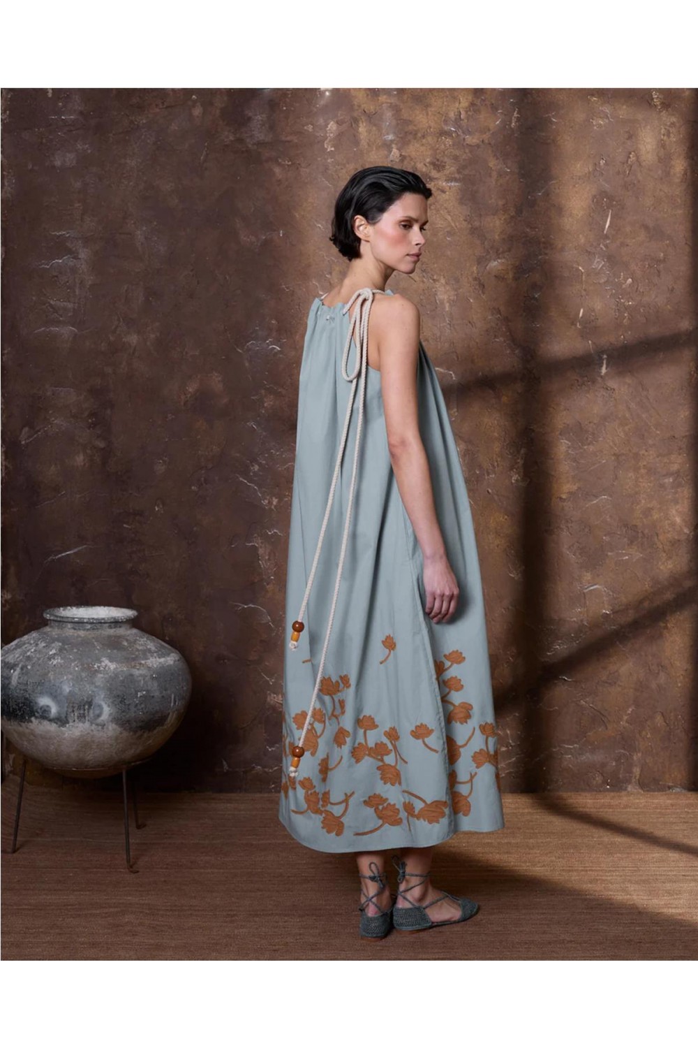 Este vestido largo, confeccionado íntegramente en algodón, destaca por su elegante cuello halter con un sistema de cierre ajustable mediante una cuerda gruesa. La pieza se distingue por el delicado detalle de flores en color contrastado, recortadas y cosidas artesanalmente en el bajo, que aportan relieve y un aire exclusivo al diseño. Su silueta fluida y los detalles ornamentales lo convierten en una opción sofisticada y con carácter. Composición: 100% Algodón.