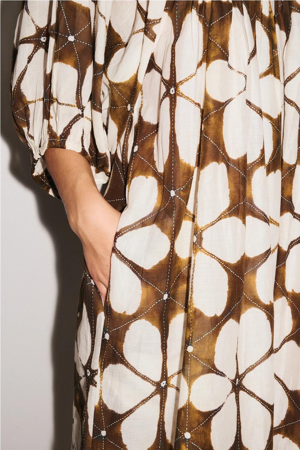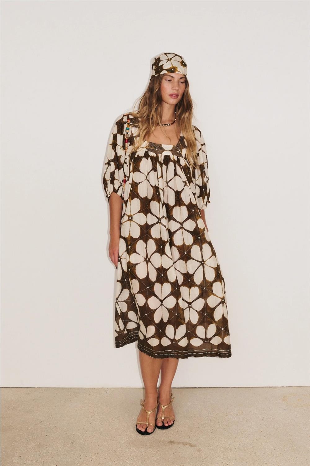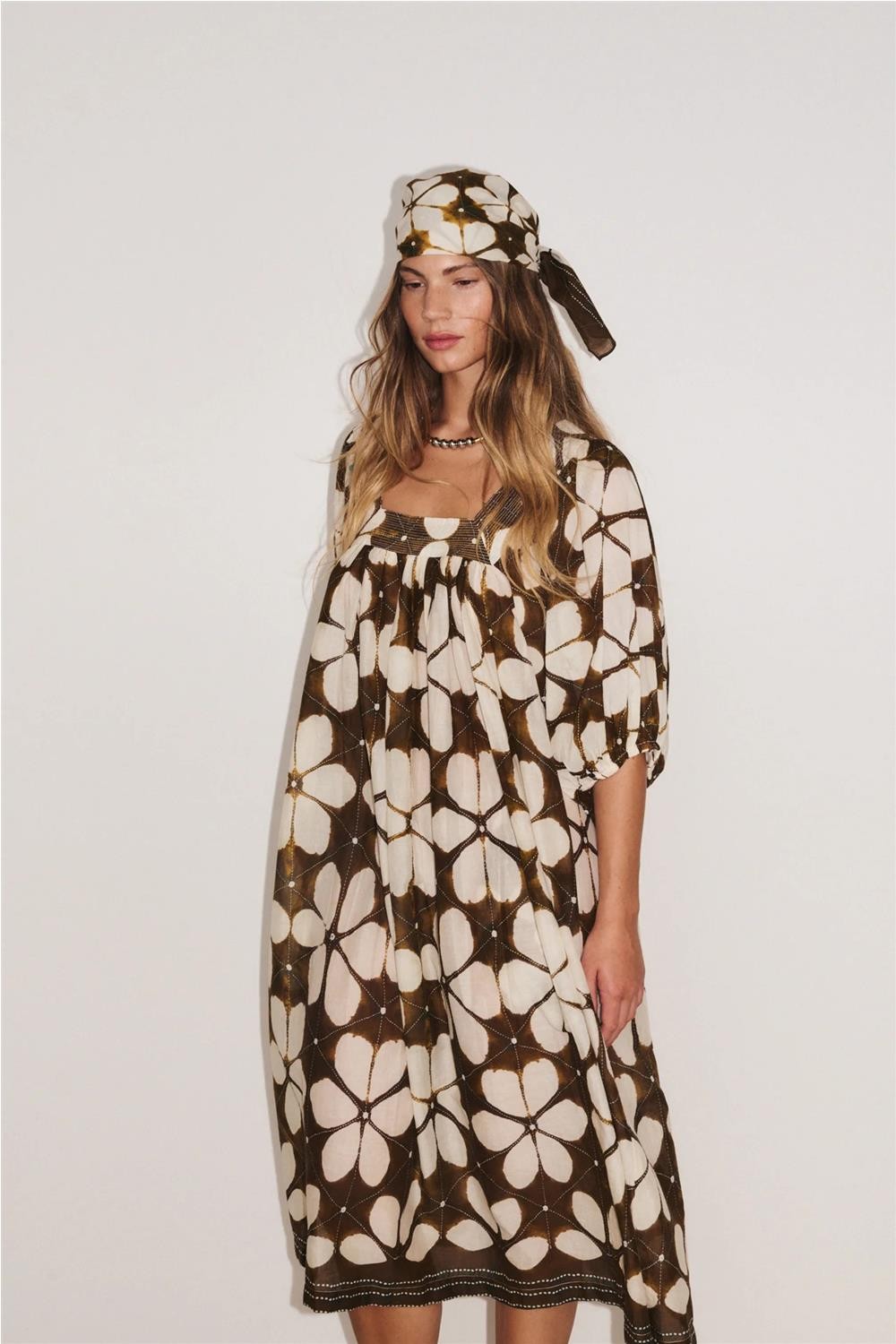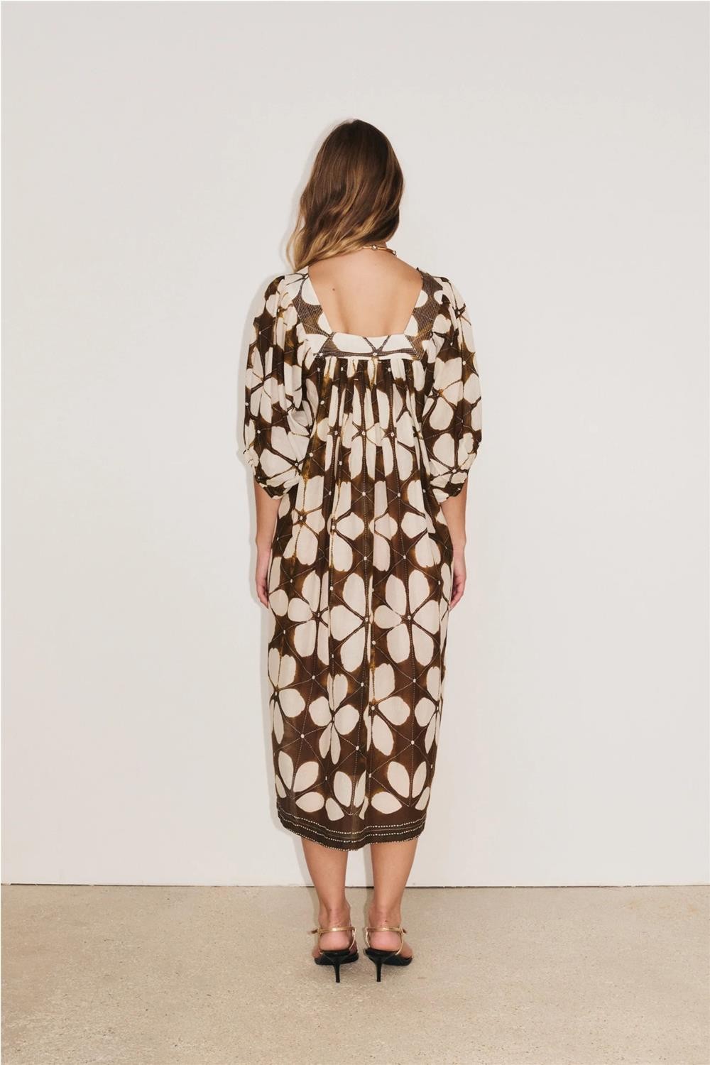 Vestido midi de mujer LOTUS Stella Forest mangas abullonadas codo azul indigo marrón E26RO043