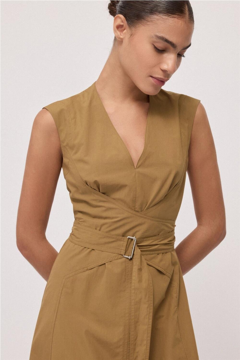 Vestido midi de mujer popelina Ottod Ame cruzado frontal cinturón avellana DA5361