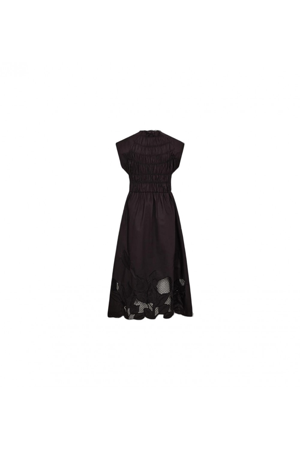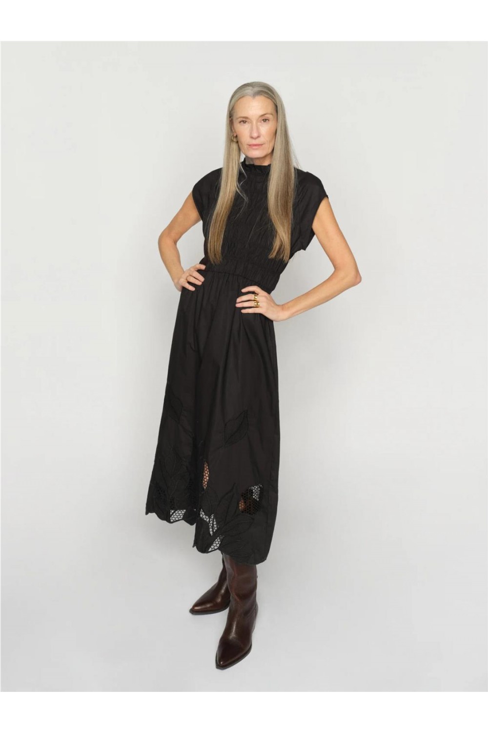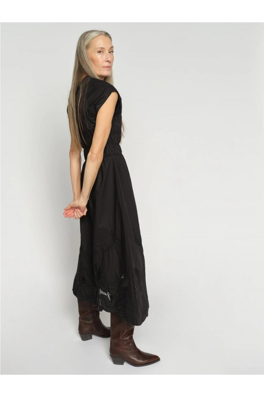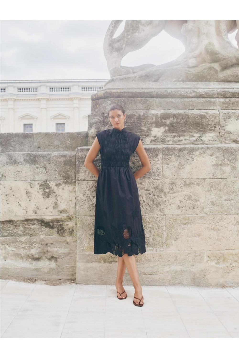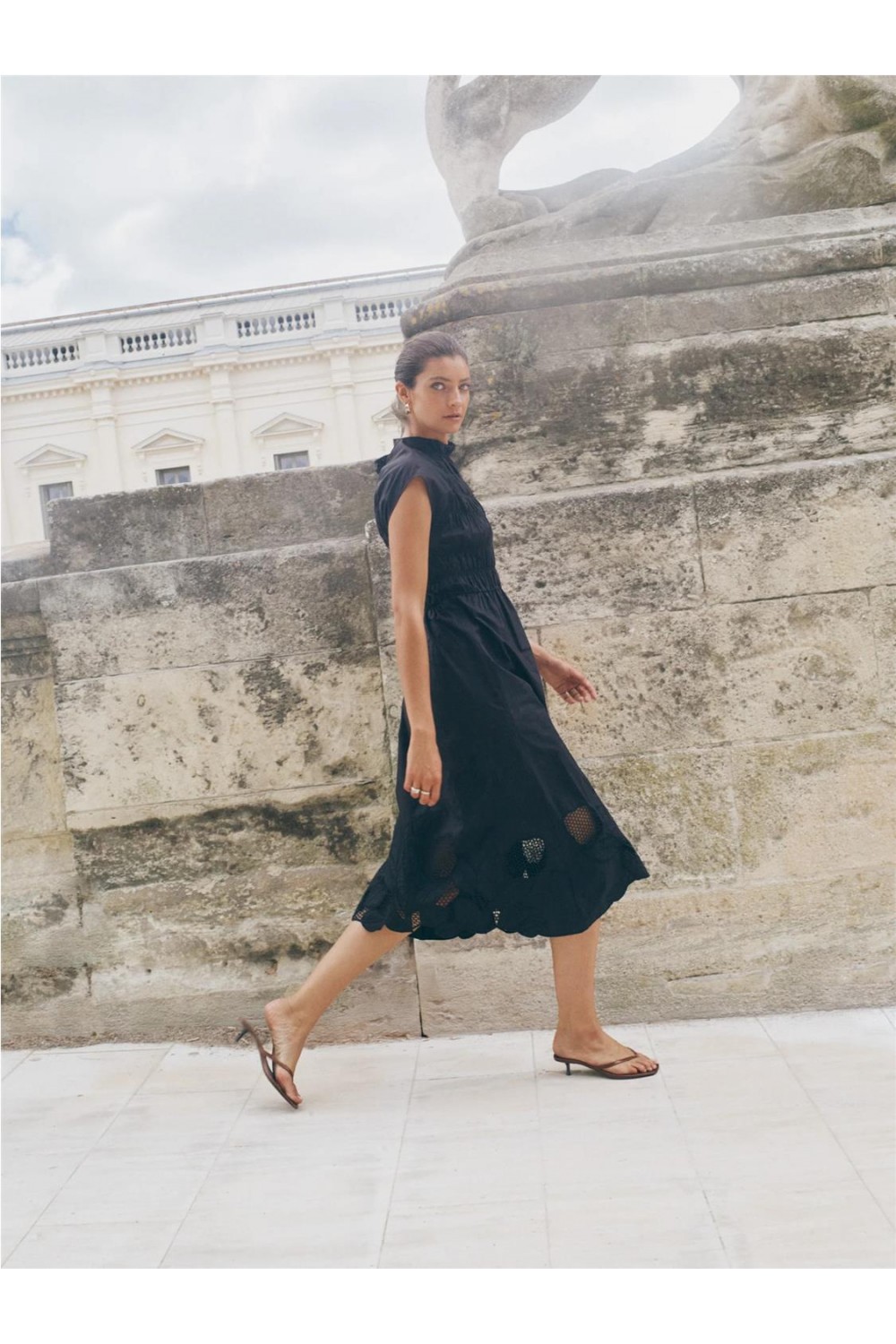 Este vestido de largo medio, una pieza atemporal confeccionada en algodón orgánico, destaca por su diseño sin mangas y sus delicados detalles bordados. Cuenta con una cintura elástica que acentúa la silueta con elegancia, combinada con un escote refinado y una falda fluida de gran movimiento. Es la prenda ideal para días soleados o eventos especiales donde se busca un estilo sofisticado y natural sin esfuerzo. Composición: 100% Algodón Orgánico.