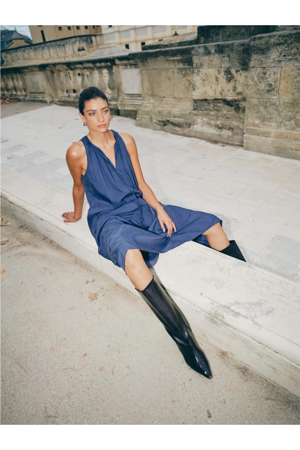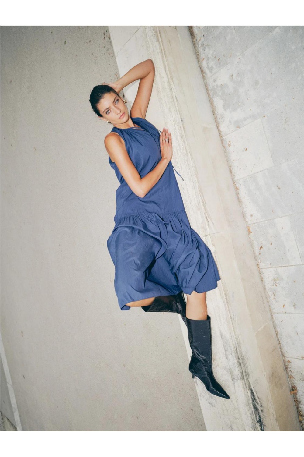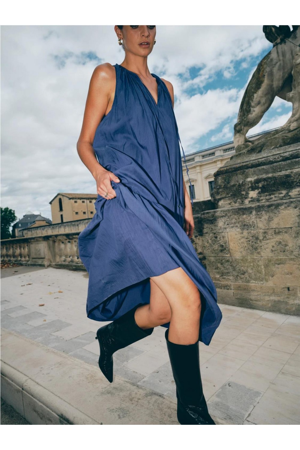 Este vestido largo de silueta fluida destaca por su falda a capas que aporta un movimiento espectacular. Presenta un escote redondo con delicados fruncidos que realzan la parte superior con elegancia. Al ser una prenda sin mangas en tejido ligero, es ideal para días calurosos, permitiendo pasar de un look informal con sandalias planas a uno sofisticado de noche con solo cambiar los accesorios. Composición: 75% TENCEL™ Lyocell, 25% Poliamida.