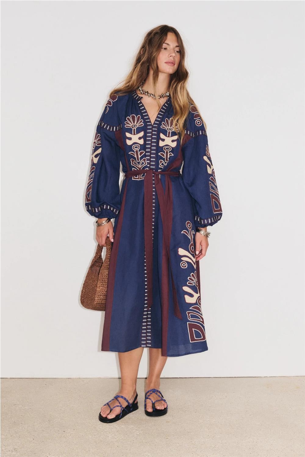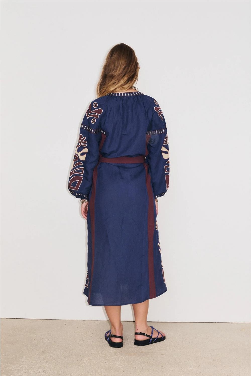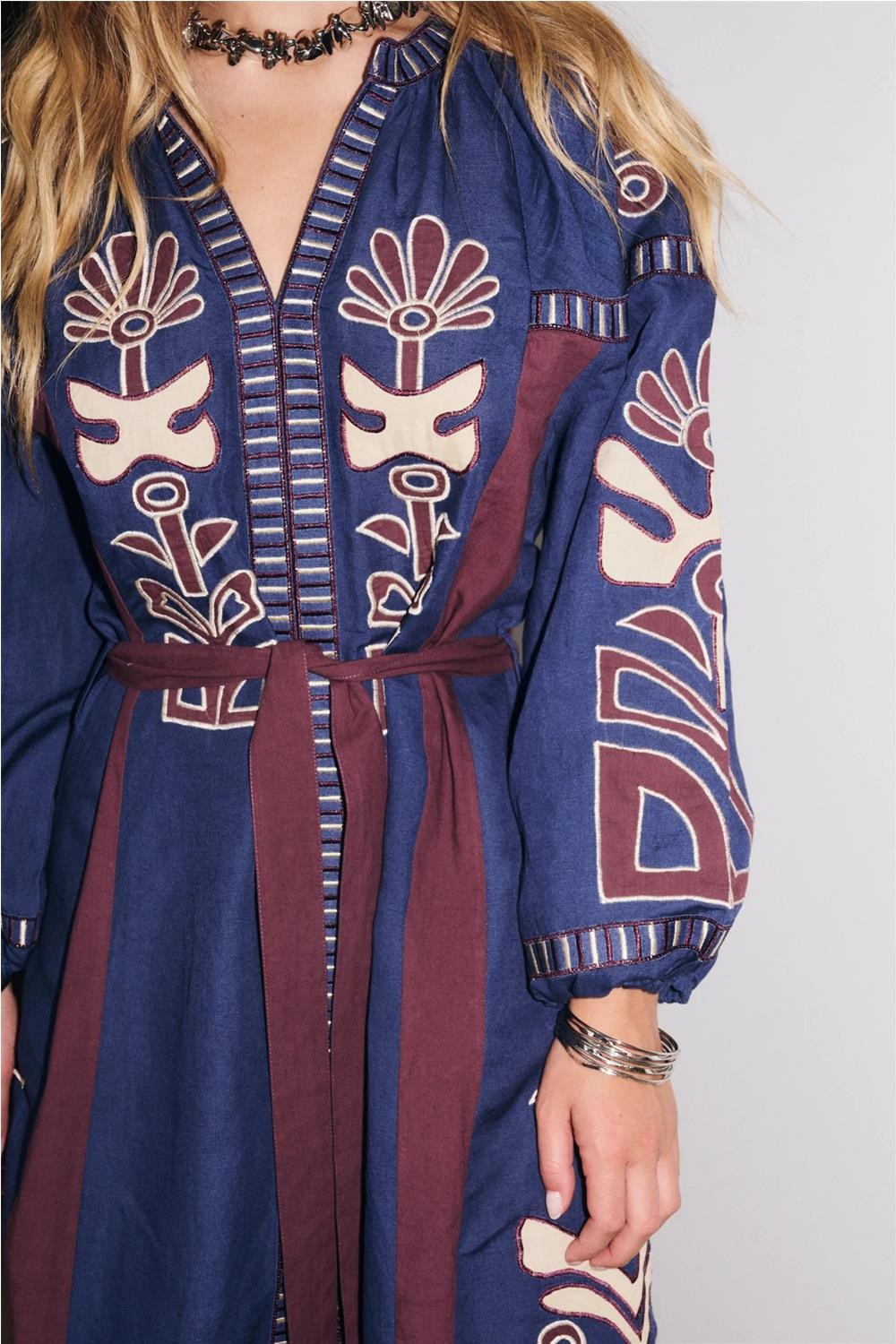 Este vestido largo, confeccionado en mezcla de viscosa y lino, destaca por su estética botánica con bordados e incrustaciones a contraste. Presenta un elegante escote tunecino, mangas raglán abullonadas con puños elásticos y un cinturón del mismo tejido que permite entallar la silueta. Su diseño artesanal combina texturas naturales con un aire refinado y atemporal, logrando una pieza sofisticada que aporta un movimiento ligero y femenino al caminar. Composición: 50% Viscosa, 50% Lino.