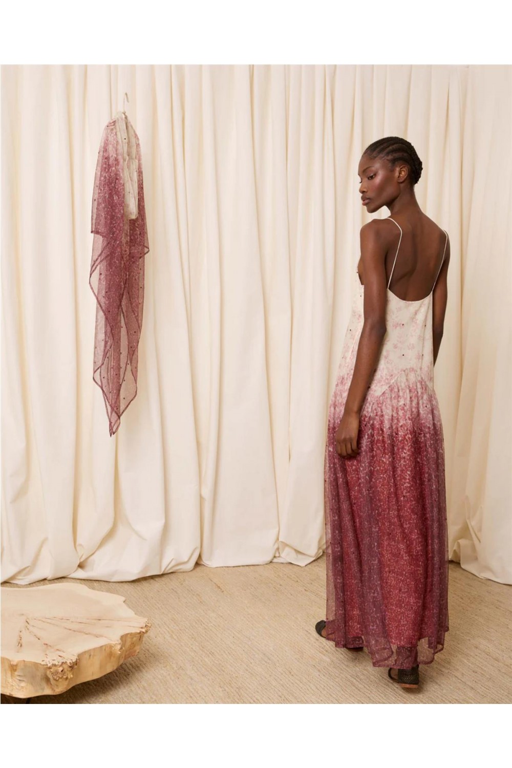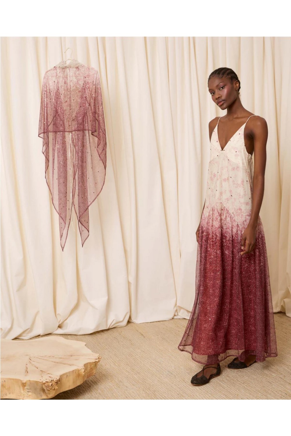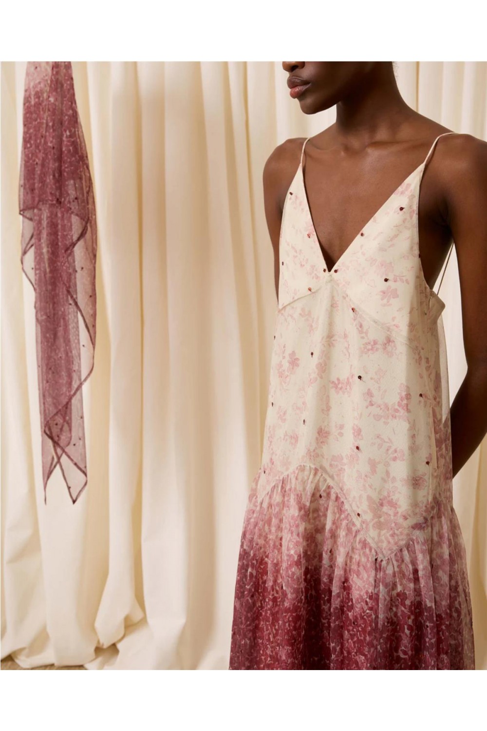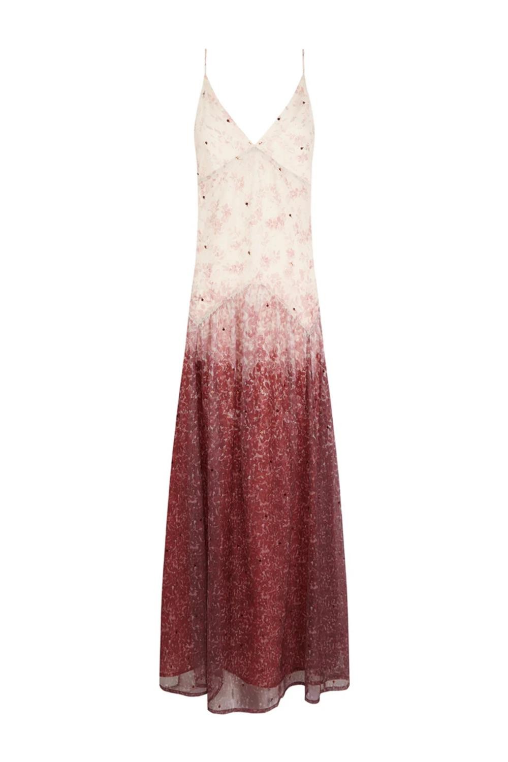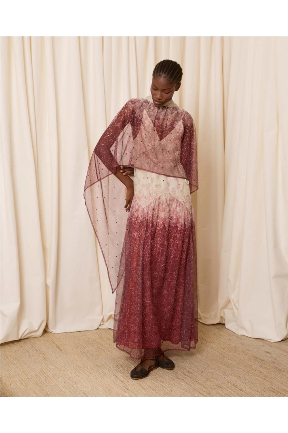 Este vestido largo de tirantes confeccionado en tul color marfil, destaca por su escote en pico y un delicado estampado de florecitas en tonos teja. El diseño evoluciona con un degradado que intensifica el color hacia el bajo, adornado con pequeñas lentejuelas que aportan un brillo sutil. El conjunto incluye una capa a juego de cuello alto fruncido y picos largos hacia la espalda, ofreciendo una silueta elegante, fluida y llena de movimiento para ocasiones especiales. Composición: 100% Poliéster