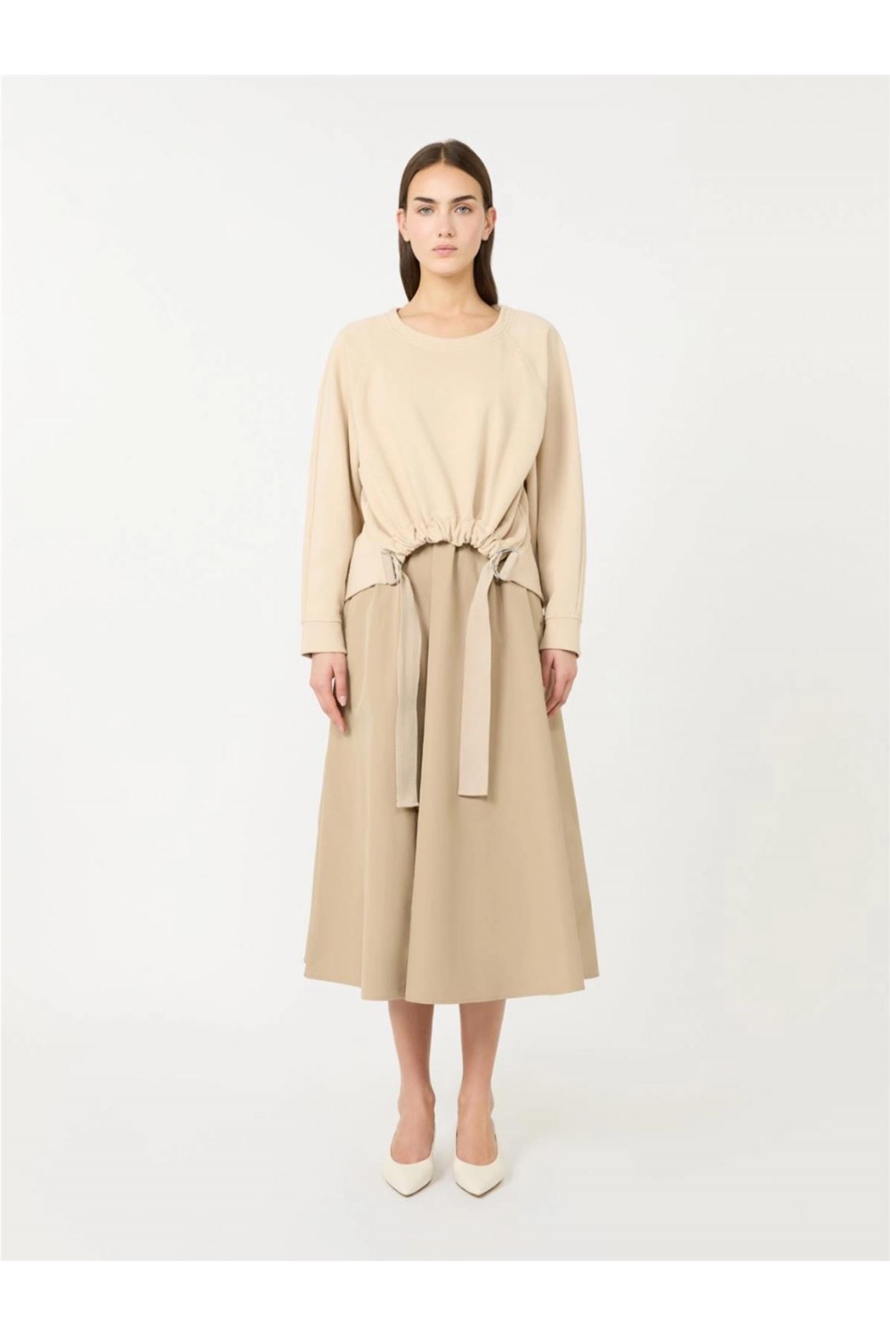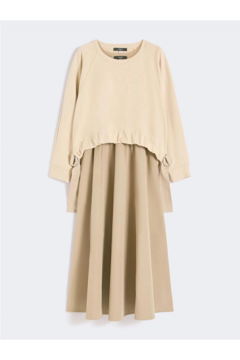 Este vestido largo presenta un diseño efecto trampantojo que une un cuerpo sin mangas con una falda de tela impermeable en contraste. El conjunto incluye una sudadera de algodón cepillado con cuello redondo y manga larga raglán, decorada con fruncidos y tiras de grogrén. De corte acampanado y ajuste regular, esta pieza de tejido técnico y algodón ofrece un estilo contemporáneo y un volumen sofisticado. Composición: Algodón, poliéster, nailon y elastano.