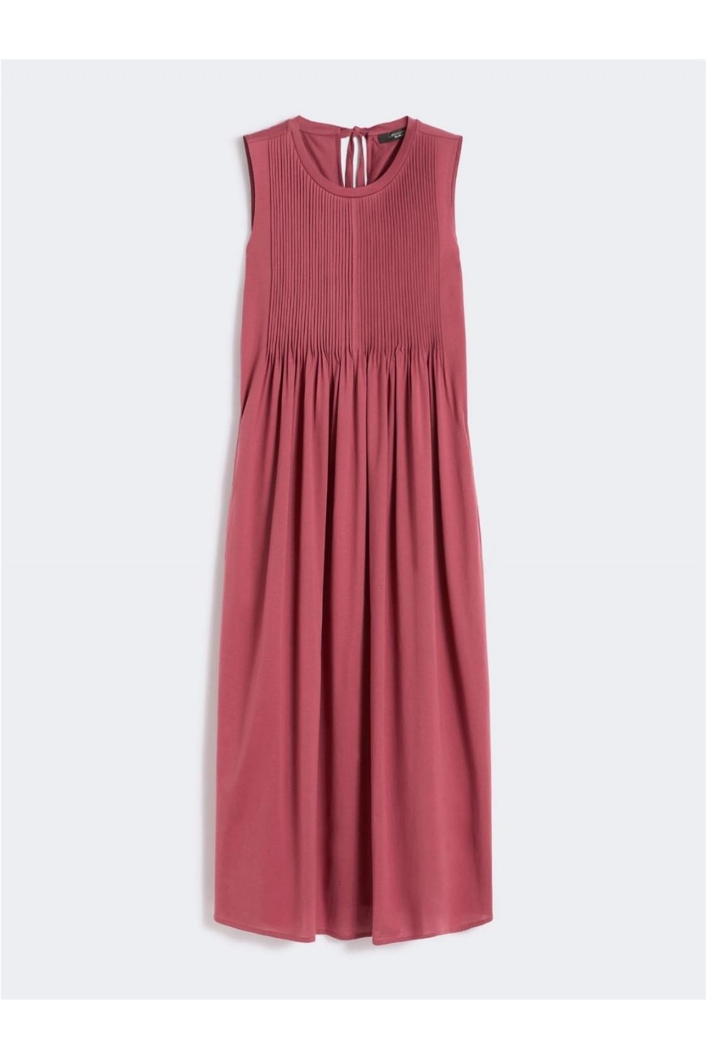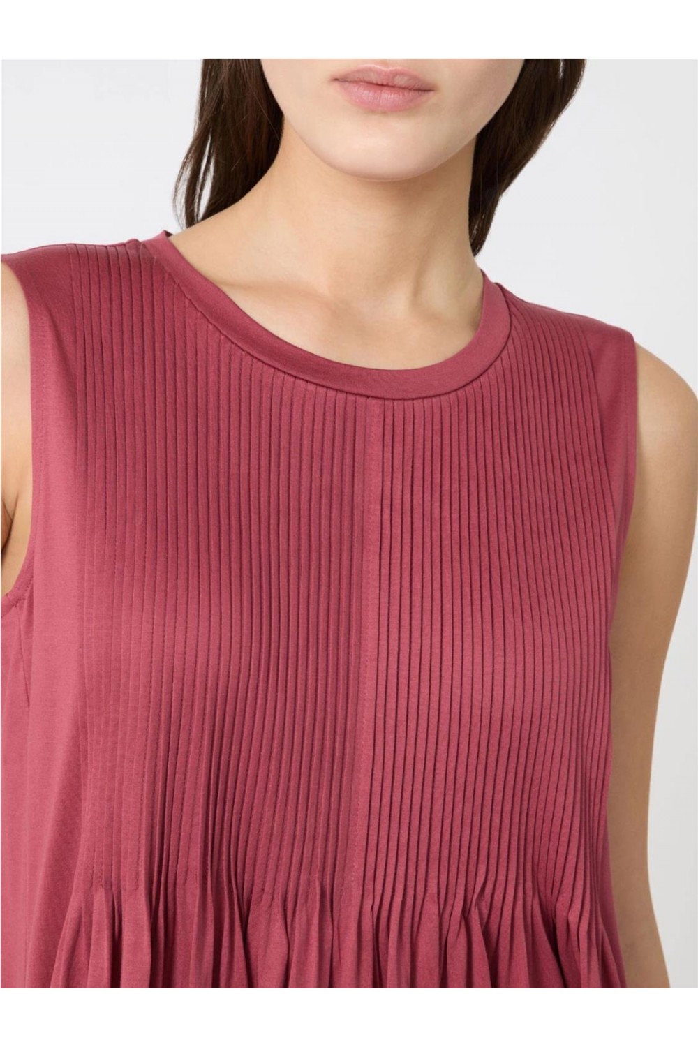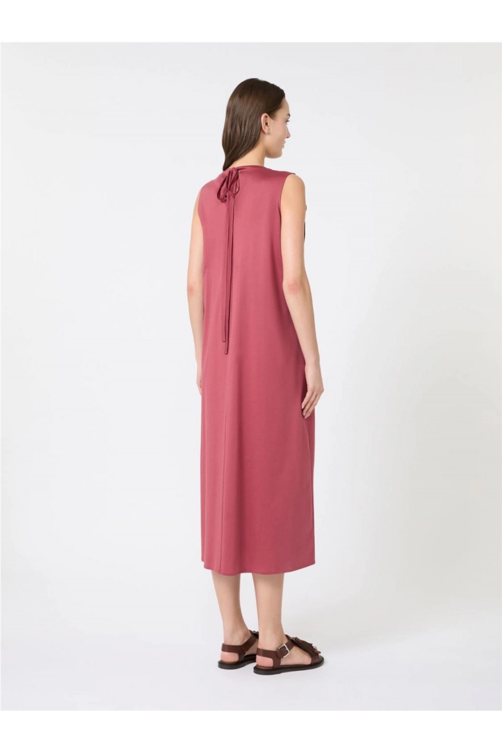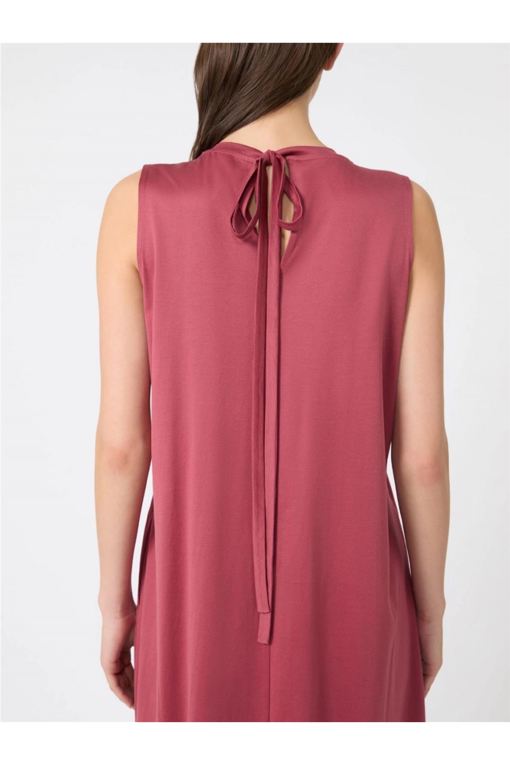 Este vestido largo sin mangas está confeccionado íntegramente en jersey de algodón puro. Su diseño destaca por un elegante motivo de pliegues en la parte delantera que aporta volumen y movimiento a la falda. Presenta cuello redondo, tirantes anchos y un sofisticado cierre de lágrima en la espalda con lazos ajustables en la nuca. De corte regular y silueta fluida, es una prenda cómoda y sin forro, ideal para un estilo estival femenino y natural. Composición: 100% Algodón.