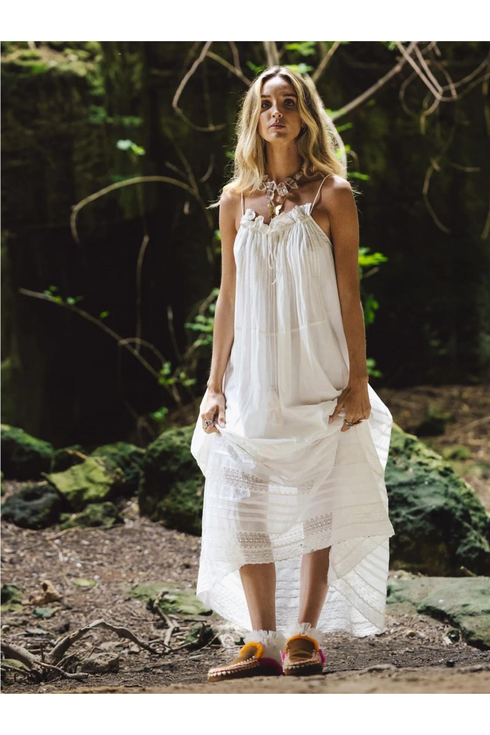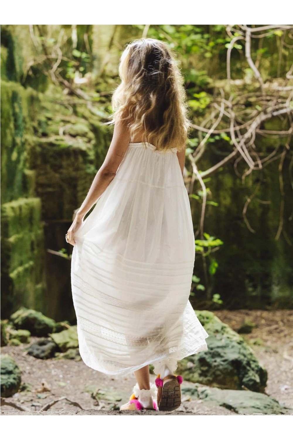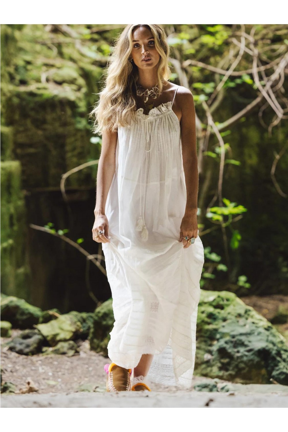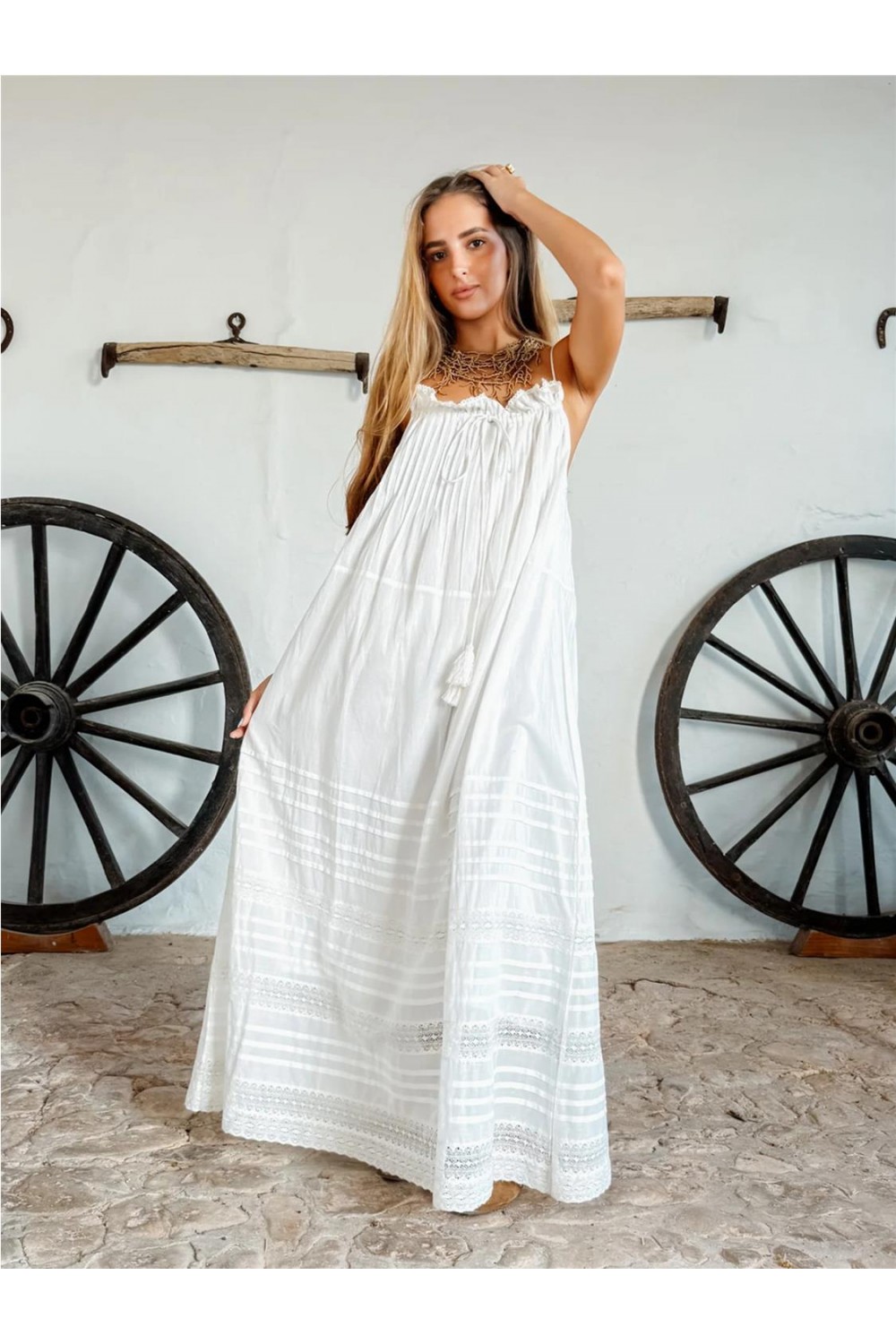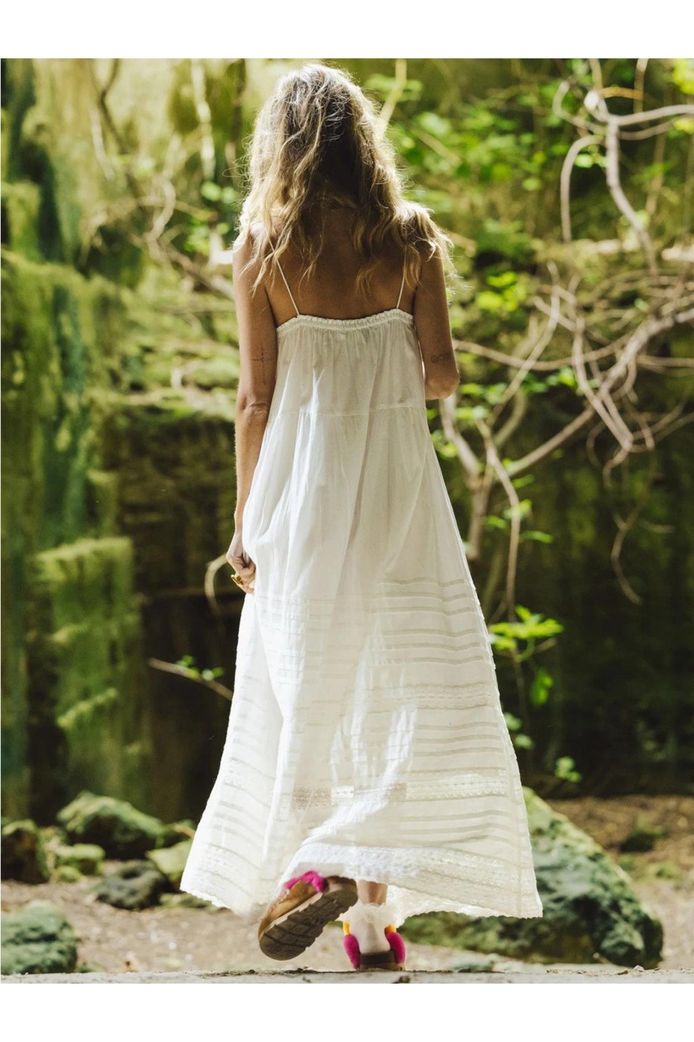 Este vestido largo destaca por su corte fluido y ligero, confeccionado en voile 100% algodón orgánico que ofrece frescura y suavidad. Presenta un diseño de tirantes finos con una caída fluida de estilo bohemio y relajado, ideal para días cálidos. Incluye detalles de pasamanería artesanal aplicados en las terminaciones y prácticos bolsillos laterales funcionales. Es una prenda atemporal y sostenible, diseñada para aportar comodidad y naturalidad. Composición: 100% Algodón orgánico.