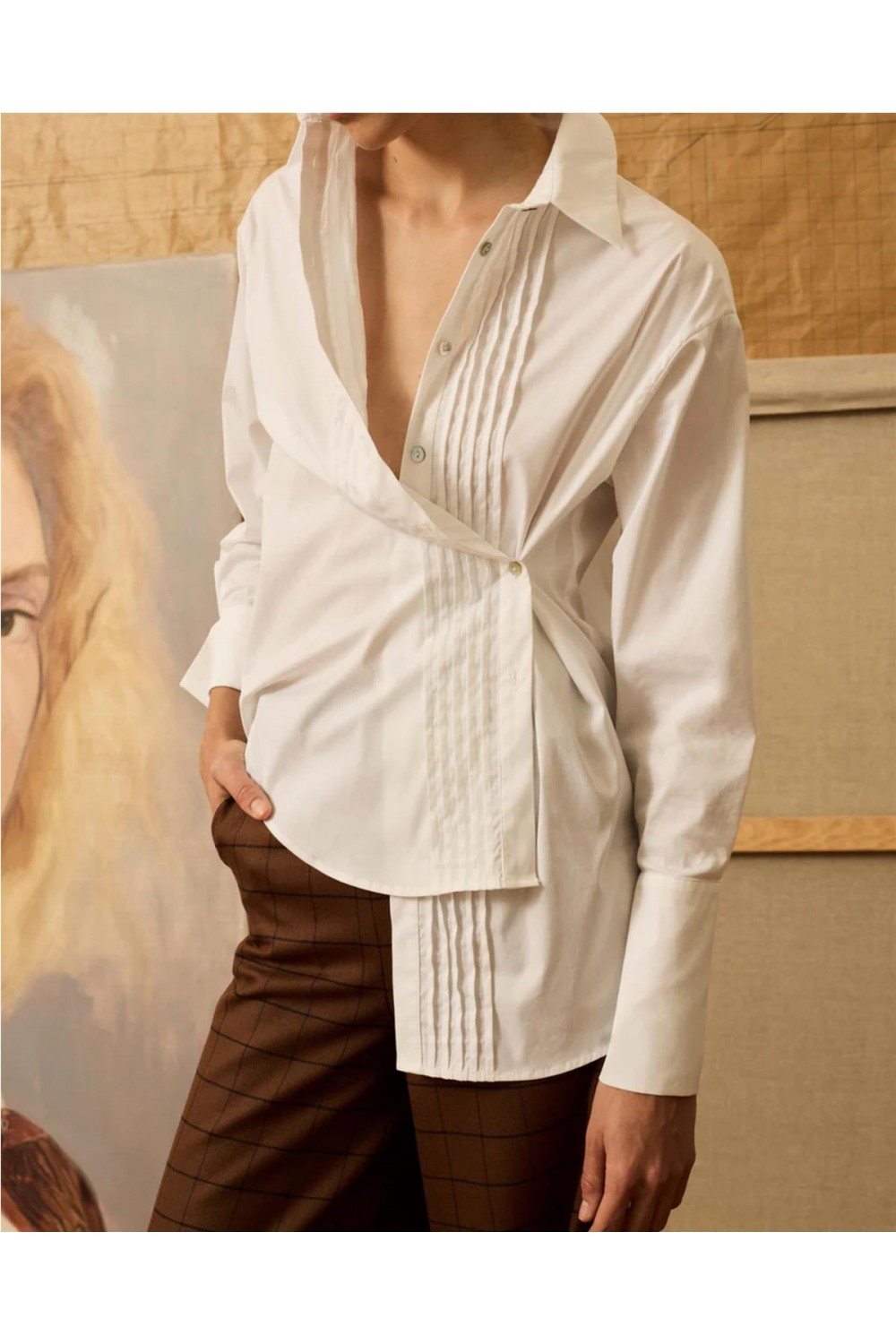 Camisa de popelin con frontal en jaretas, amplio puño para poder doblar y detalle de botón para abrochar cruzada. Composición: 74% Algodón; 21% Poliamida, 5% Elastano.