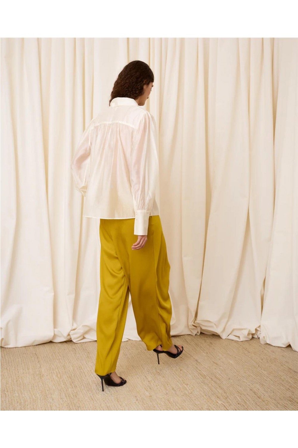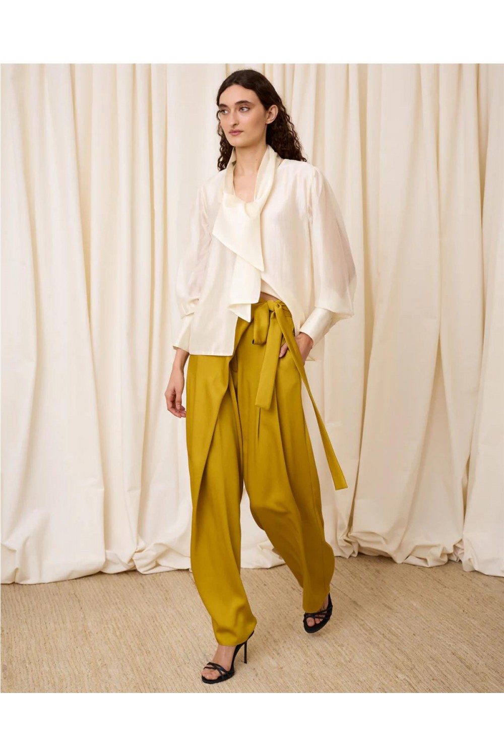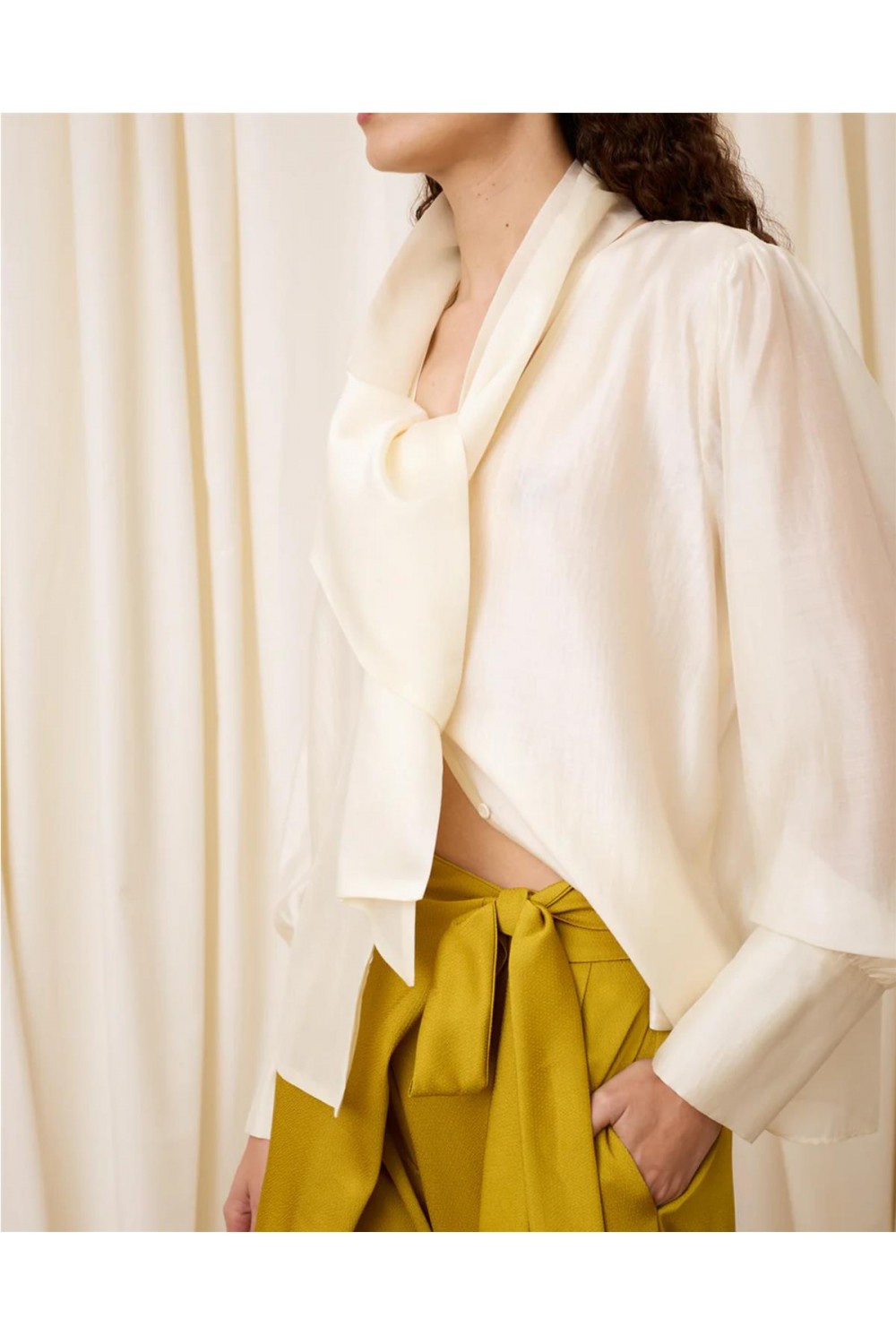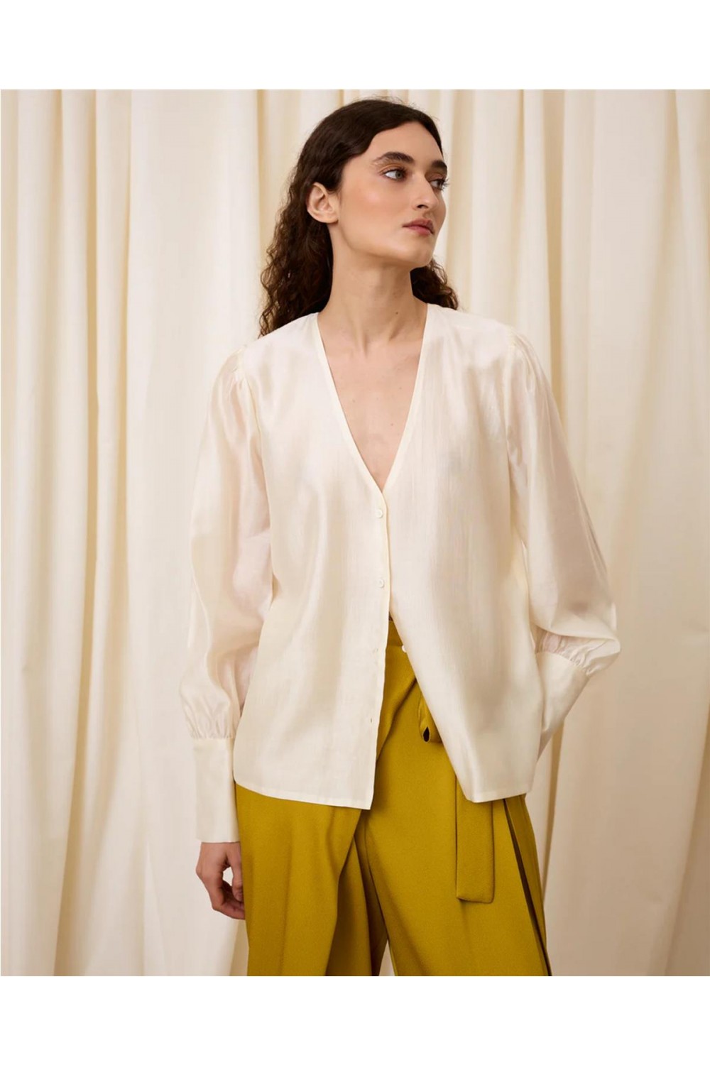 Esta elegante blusa destaca por su diseño romántico y sofisticado. Presenta un favorecedor escote en pico que realza la silueta, complementado con unas favorecedoras mangas abullonadas y puños anchos que aportan volumen y estilo. Un detalle exclusivo es que incluye un pañuelo a juego, ideal para personalizar tu look. Su tejido garantiza una caída fluida y un tacto suave, siendo una opción versátil tanto para eventos como para el día a día. Composición: 85% Lyocell, 15% Poliéster Reciclado.