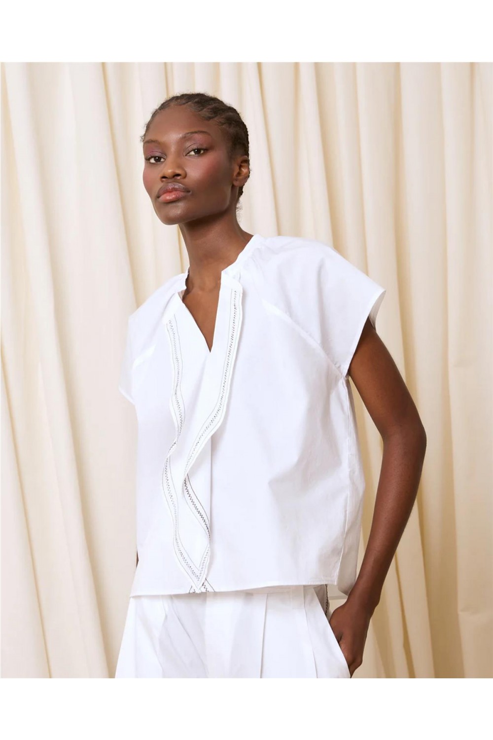 Esta blusa de popelín es un clásico renovado que combina frescura y elegancia. Su diseño destaca por la manga corta y los delicados bordados en contraste, que aportan un toque artesanal y sofisticado a la prenda. Fabricada íntegramente en algodón de alta calidad, ofrece un tacto suave y una excelente transpirabilidad, siendo ideal para los días calurosos. Es una pieza versátil y atemporal, perfecta para crear looks impecables tanto de oficina como informales. Composición: 100% Algodón.
