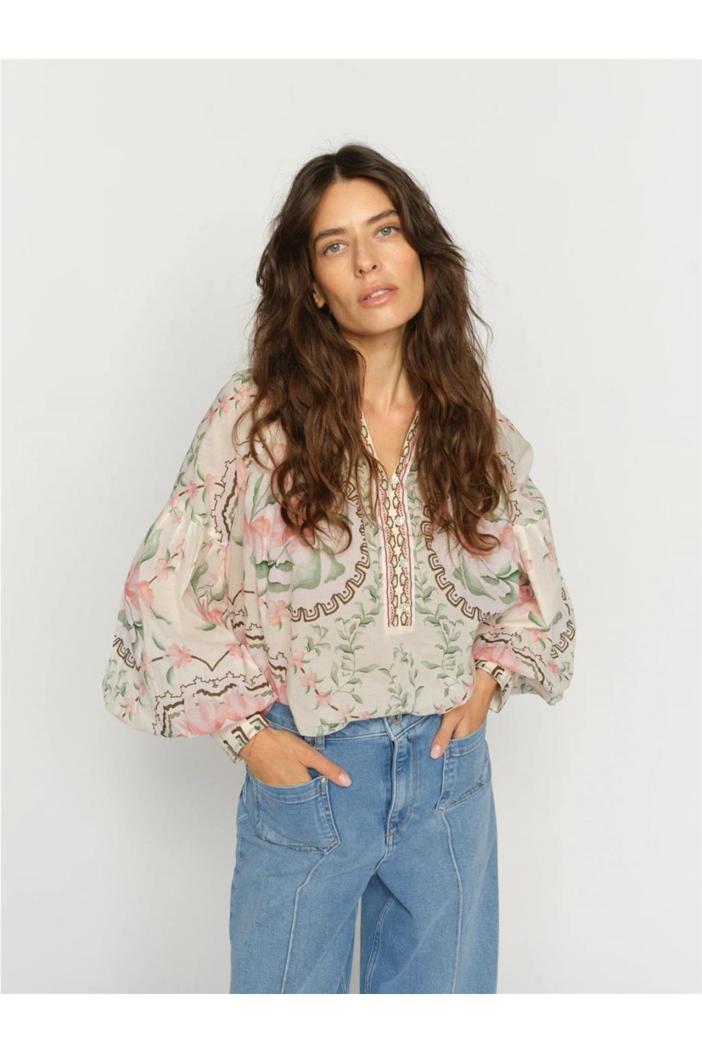 Blusa de patrón oversize confeccionada en algodón puro que destaca por su frescura y su llamativo estampado floral de orquídeas. Este diseño se define por su favorecedor escote en V y sus sofisticadas mangas abullonadas, que finalizan en puños abotonados para aportar estructura y volumen. Una prenda de silueta amplia y cómoda que combina una estética romántica con un estilo moderno, ideal para crear looks con carácter y elegancia. Composición: 100% Algodón.