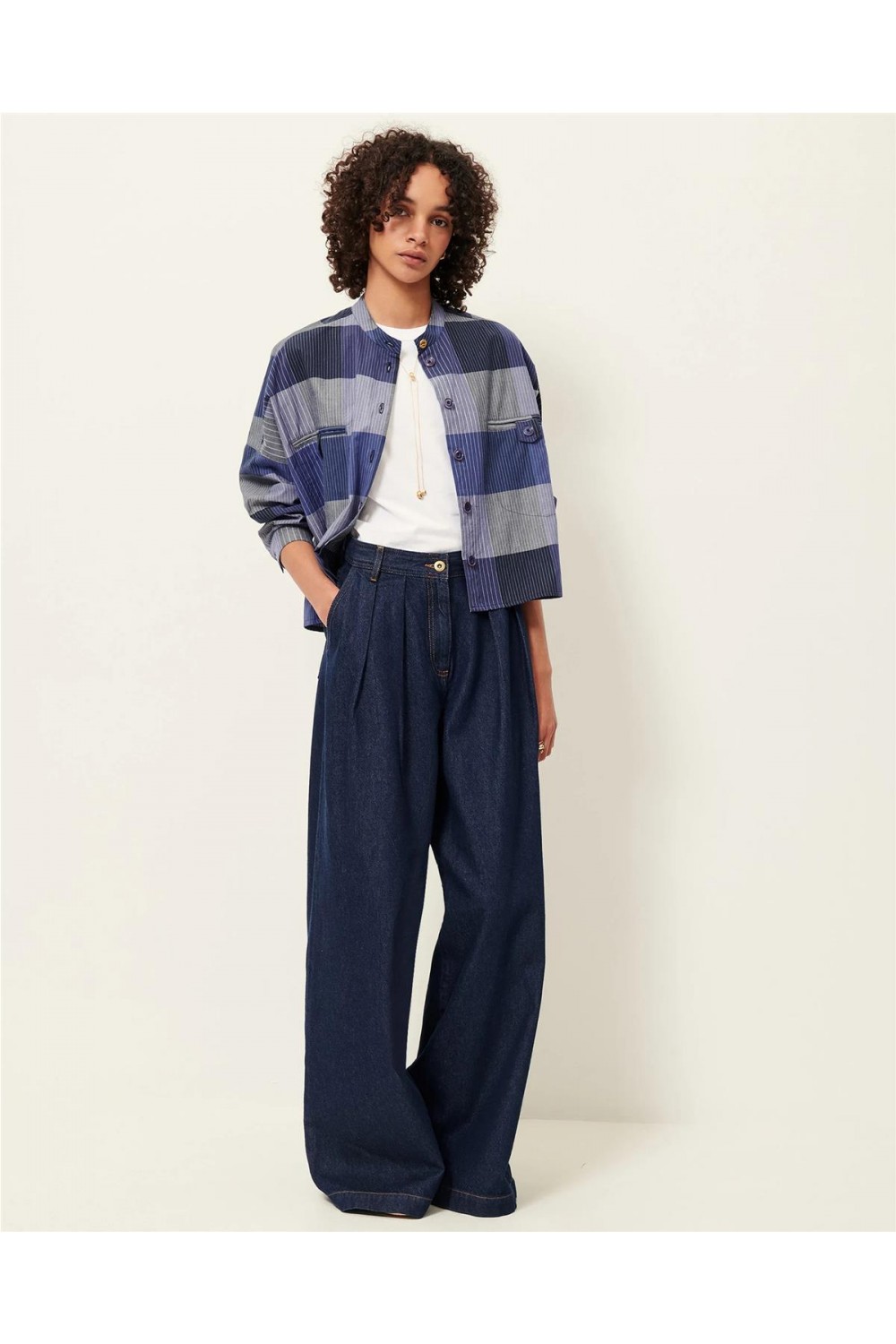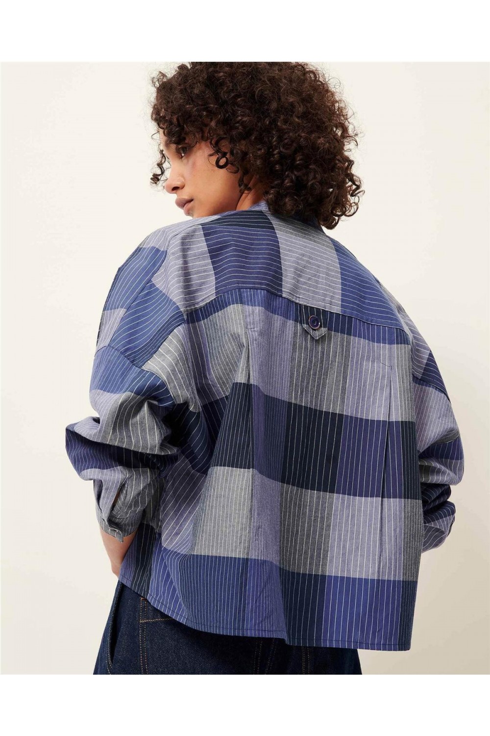 Esta camisa corta, confeccionada en popelín flexible de algodón con un exclusivo motivo de cuadros madras y rayas, destaca por su diseño de inspiración italiana. Presenta un cuello redondo con un elegante botón joya, cierre abotonado y sisa baja con manga larga. Su estética se completa con bolsillos de ojal con tapetas abotonadas en el pecho y sofisticadas puntadas a contraste, logrando una prenda estructurada y femenina de aire contemporáneo. Composición: 100% Algodón.
