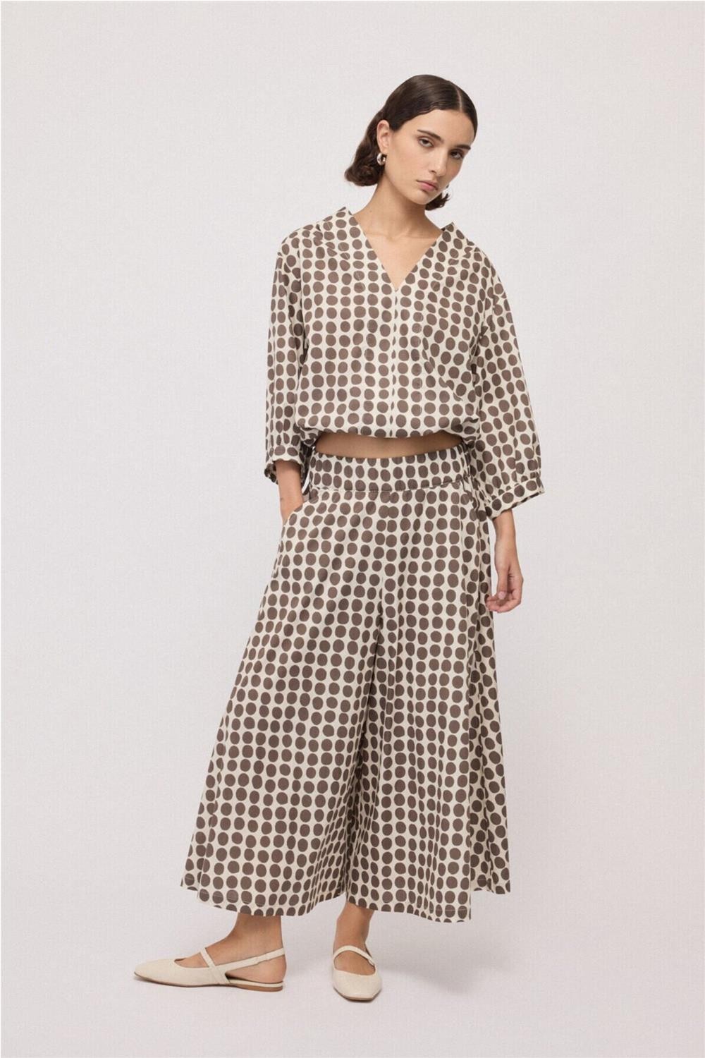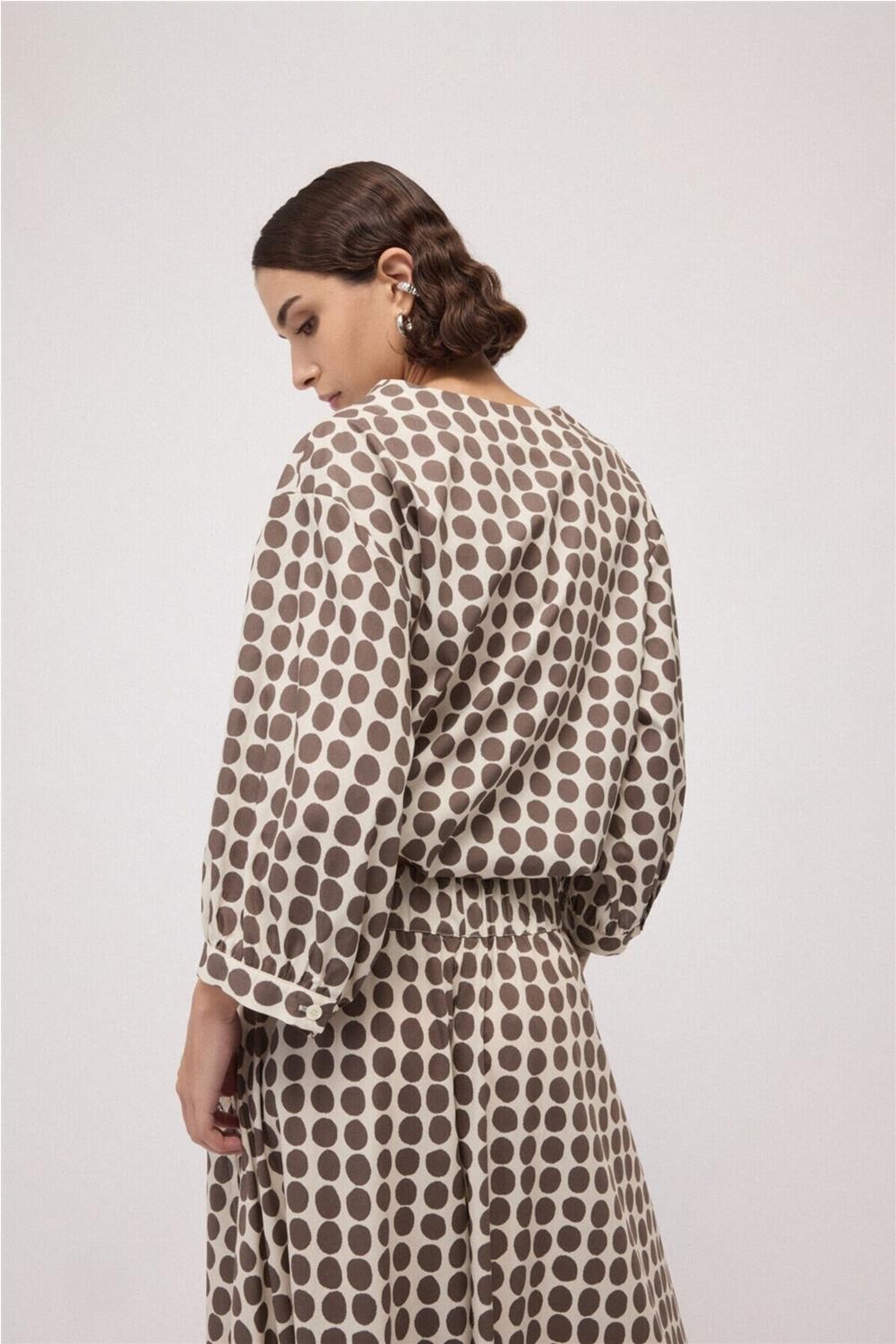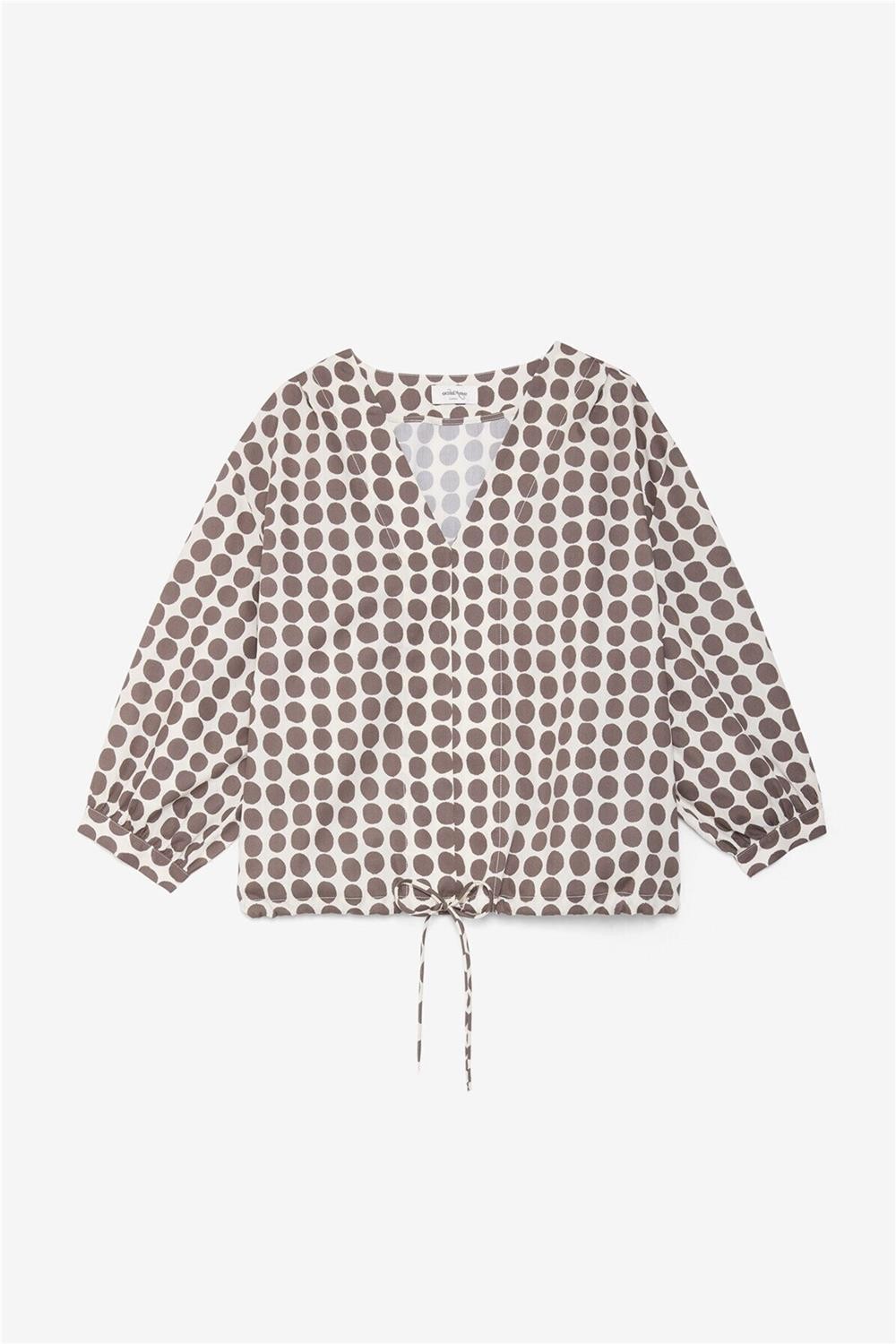 Blusa de mujer cuello en V Ottod Ame estampado lunares cordón marrón DC5275