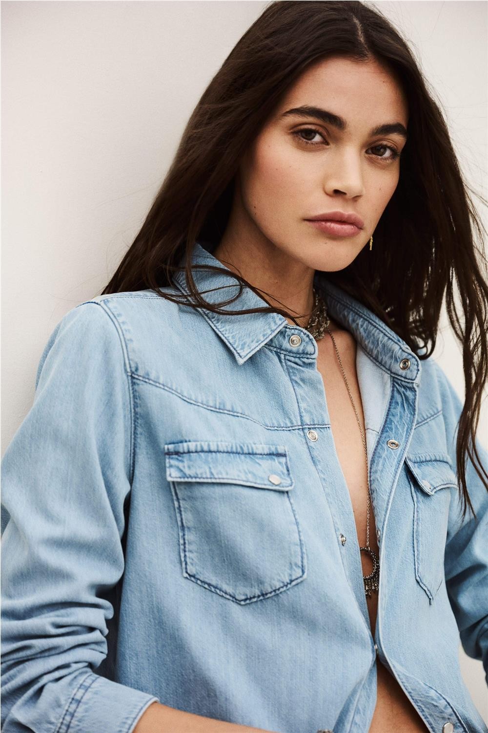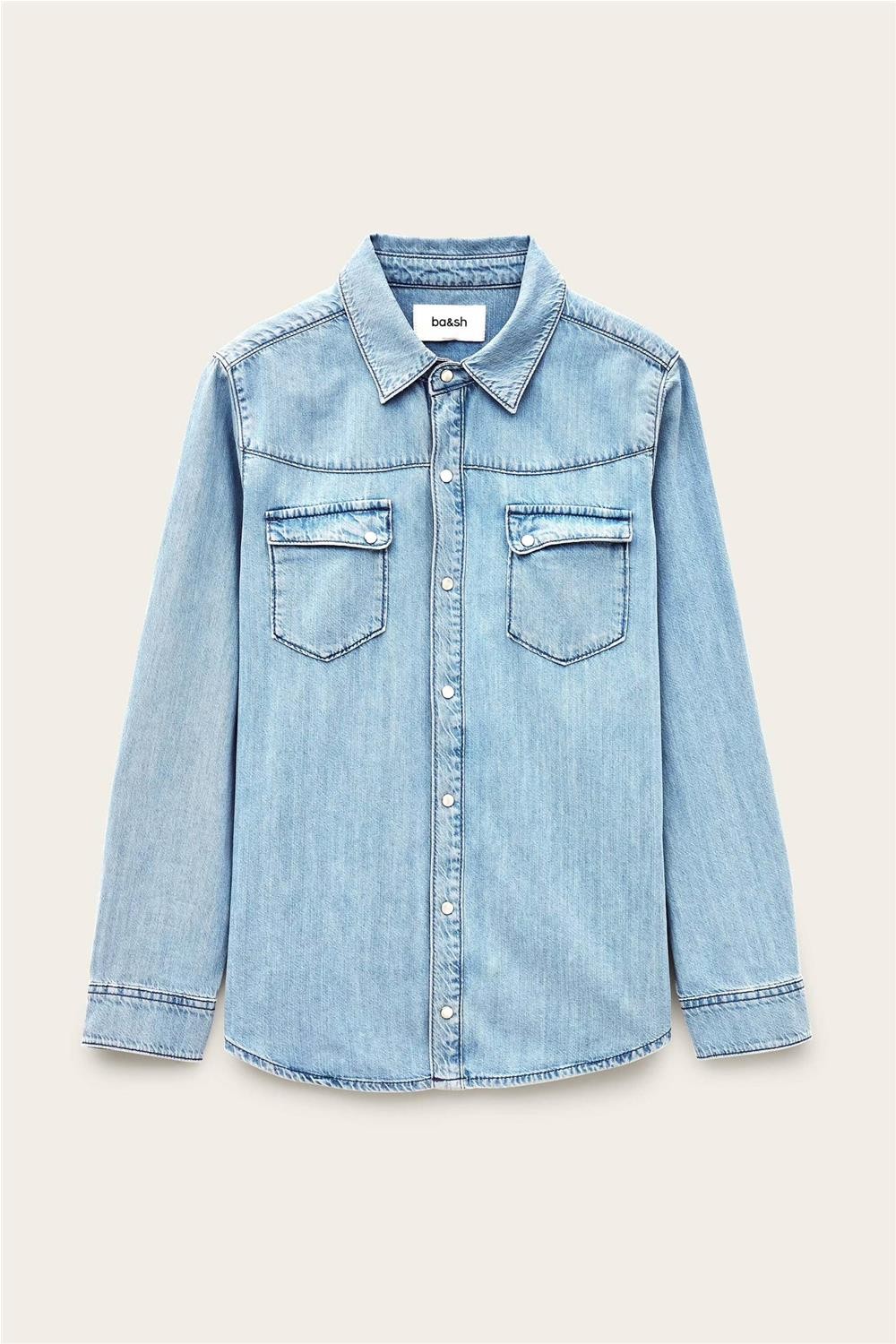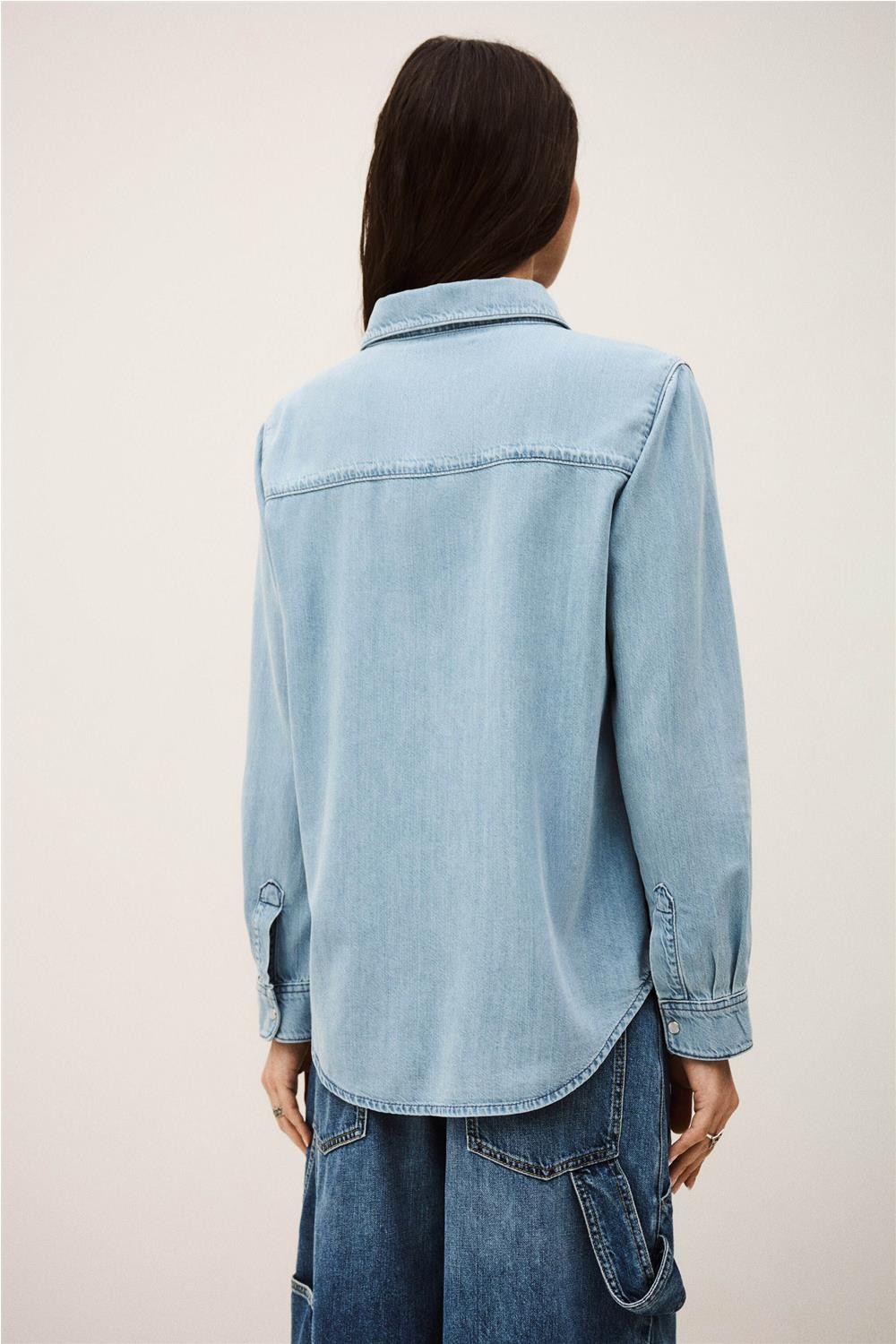 Esta camisa vaquera, confeccionada en una suave mezcla de lyocell y algodón, destaca por su diseño de inspiración western y su lavado azul claro. Presenta un cuello clásico y un cierre frontal con botones automáticos nacarados, complementado con dos prácticos bolsillos de parche con solapa en el pecho y un canesú pespunteado. Gracias a su tejido fluido y su corte versátil, esta pieza es ideal para completar conjuntos casuales con un toque femenino y moderno. Composición: 60% Lyocell, 40% Algodón