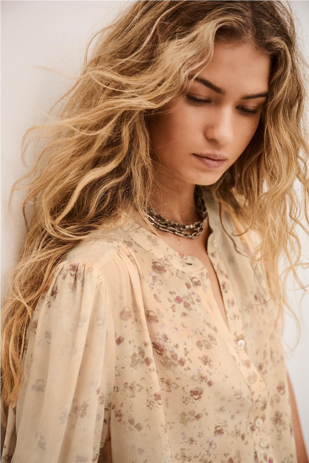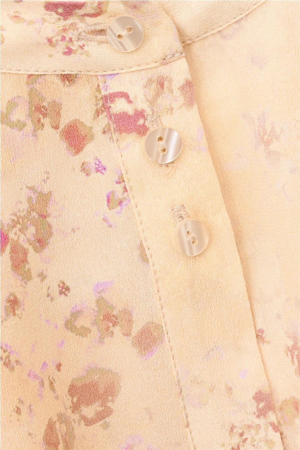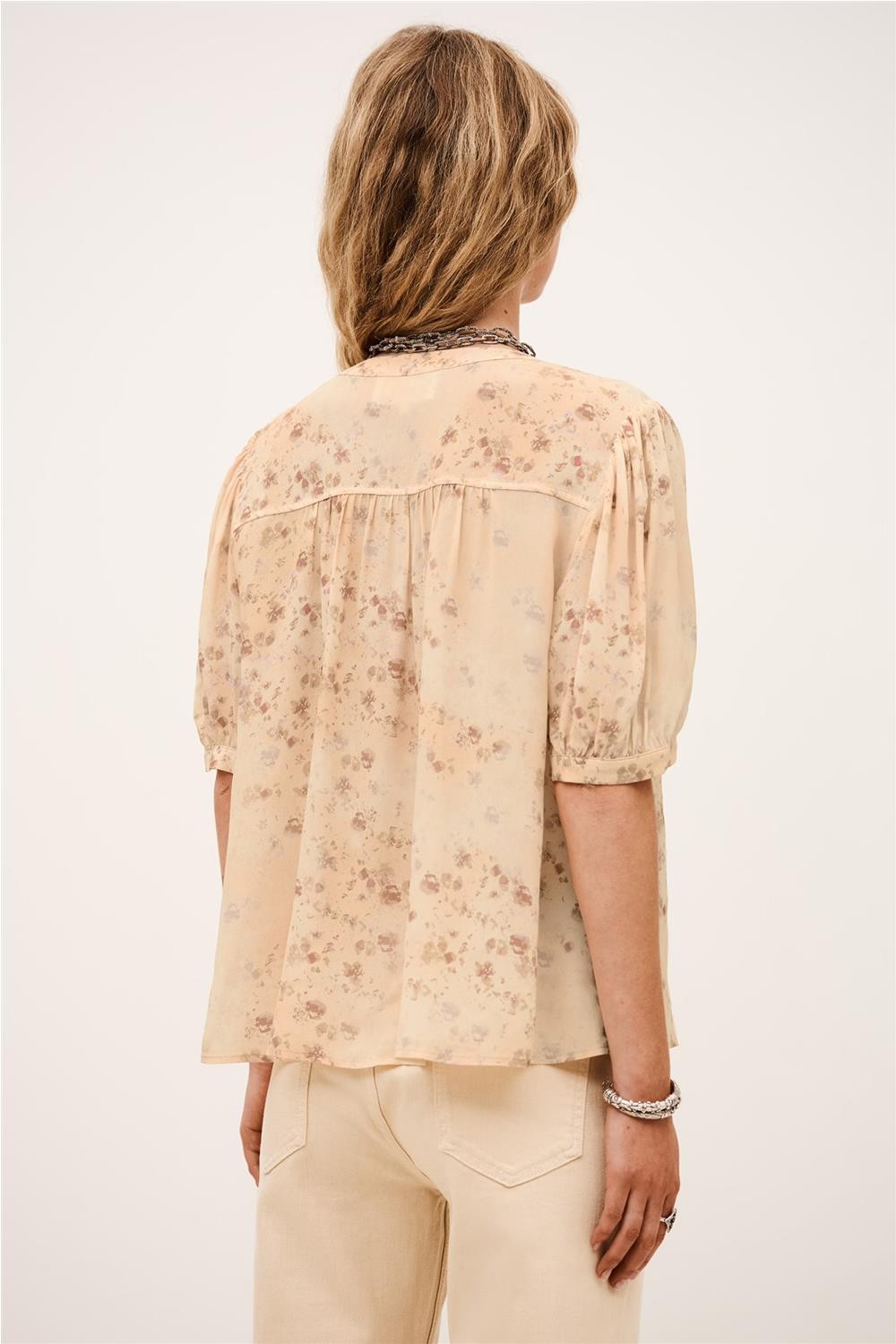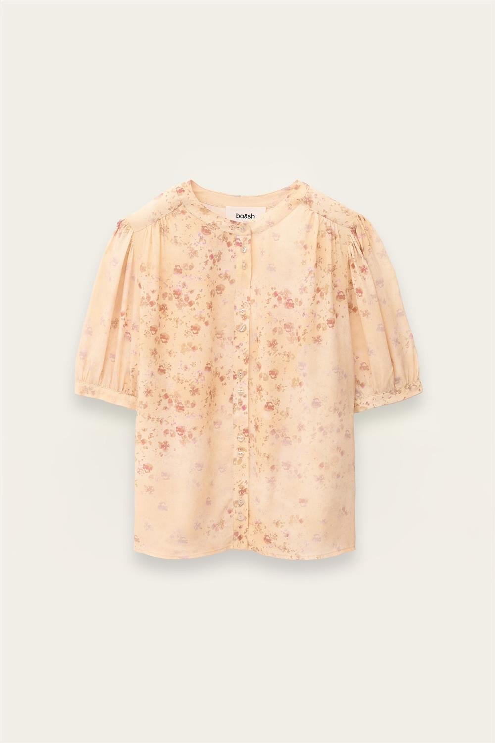 Esta blusa, confeccionada íntegramente en viscosa, destaca por su delicado estampado floral y su silueta fluida de aire romántico. Presenta un cuello redondo sutilmente elevado y un cierre frontal de botones, junto con mangas cortas abullonadas que aportan volumen y feminidad. Su diseño incluye suaves frunces en hombros y canesú trasero, realzando su caída ligera. Gracias a su estética fresca, es una pieza ideal para completar looks estivales con elegancia natural. Composición: 100% Viscosa.