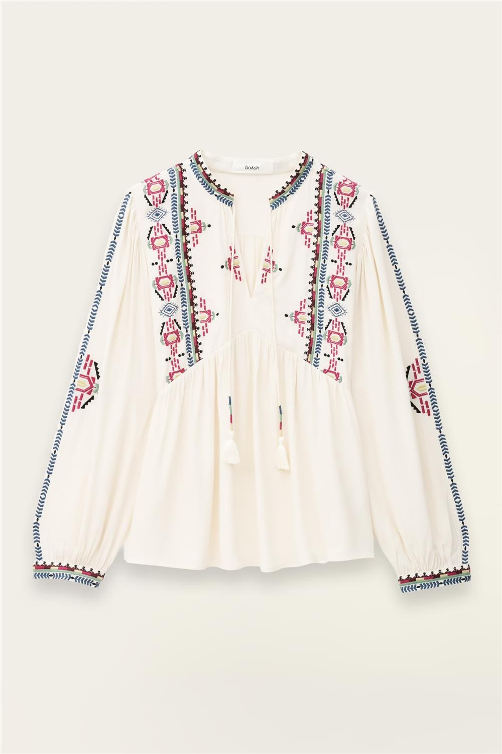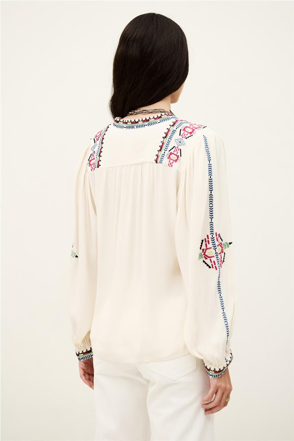 Esta blusa, confeccionada íntegramente en viscosa, destaca por su diseño de inspiración étnica con bordados multicolores. Presenta un escote en V con cordones y borlas, además de elegantes frunces en pecho y espalda que aportan un volumen fluido. Sus mangas largas abullonadas, rematadas con puños bordados, completan esta silueta de aire bohemio y sofisticado. Es una pieza llena de personalidad, ideal para aportar un toque artesanal y distintivo a cualquier conjunto. Composición: 100% Viscosa.