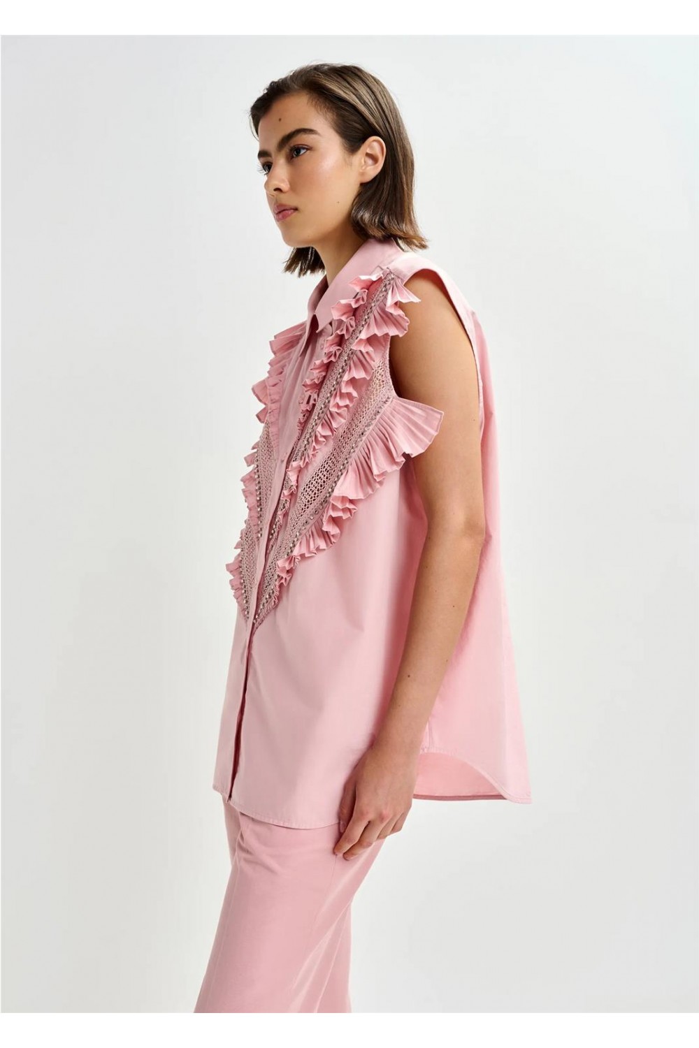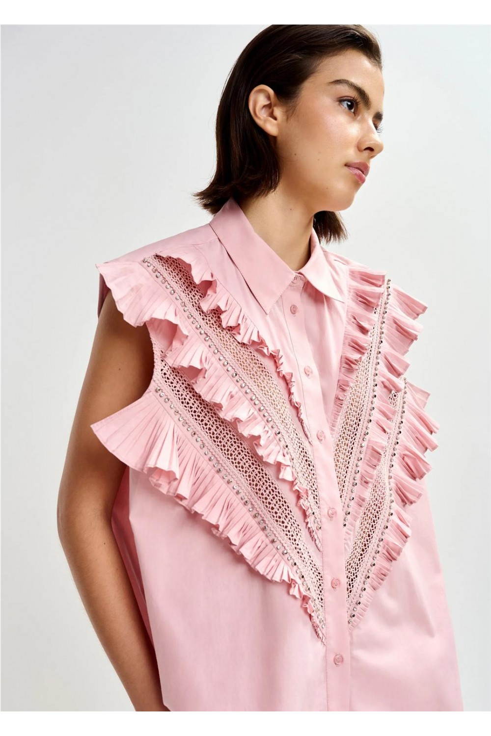 Esta camisa destaca por su confección en algodón ligero con un diseño de corte holgado y silueta sin mangas. Presenta un cuello clásico, cierre frontal de botones y detalles de volantes que aportan estructura a la prenda. Las aberturas con encaje calado añaden textura, mientras que los bordados de strass y cuentas proporcionan un acabado refinado y sofisticado a esta pieza única. Composición: 100% Algodón. Pedritas: 50% Latón, 50% Vidrio. Cuentas: 90% Poliéster, 10% Latón.
